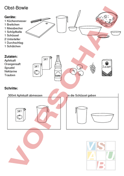 ObstBowle Geräte: 1 Küchenmesser 1 Brettchen 1 Messbecher 1 Schöpfkelle 1 Schüssel 2 Unterteller 1 Durchschlag 1 Schälchen Zutaten: Apfelsaft Orangensaft Sprudel Nektarine Trauben Schritte: 300ml Apfelsaft abmessen in die Schüssel geben 300ml Orangensaft abmessen in die Schüssel geben 300ml Sprudel abmessen in die Schüssel geben Obst SORGFÄLTIG waschen schlechte Stellen entfernen Obst schneiden in die Schüssel geben Zucker auf Unterteller geben Saft auf Unterteller