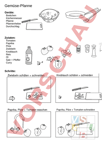 Gemüse-Pfanne Geräte: Brettchen Küchenmesser Pfanne Pfannenheber Durchschlag Zutaten: Tomaten Paprika Pilze Zwiebeln Knoblauch Reis Öl Salz Pfeffer Curry Schritte: Zwiebeln schälen schneiden Knoblauch schälen schneiden Paprika, Pilze Tomaten waschen Paprika, Pilze Tomaten schneiden Öl in Pfanne geben Zwiebeln Knoblauch anbraten Paprika, Pilze Tomaten dünsten abschmecken mit Reis vermischen servieren