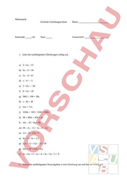 Mathematik Punktzahl:/24 Einfache Gleichungen lösen Name: Note: Unterschrift: 1. Löse die nachfolgenden Gleichungen richtig auf. a) 3 6x 57 b) 6x – 9 39 c) 5x – 4 41 d) – 6 - 3 e) 2 8x - 38 f) 8 6x 20 g) 3862 100 38x h) : 36 28 i) 55x 715 j) 1100x 100 1100 100x k) 38 400x 434 4x l) 16x – 35 8x 85 m) 39 – 2x – 15 5x – 6 – 2x n) 11x – 9 13x 7 o) 4x – 3 3x 2.5 p) 2 (x 1) 3 (x – 1) 39 q) 16x 19 5 (4 3x) r) 4x 6x 3 2x 6 3x 5x 5 9 (/18) 2. Forme die nachfolgenden Textaufgaben in eine Gleichung um und löse sie richtig auf. a) Wenn ich zu einer Zahl 27 addiere, so erhalte ich 69. b) Welche Zahl muss ich mit 7 multiplizieren, um 9 weniger als 100 zu erhalten? c) Wenn ich zu einer Zahl zuerst 12, dann 17 addiere, so erhalte ich als Summe 42. (/6)