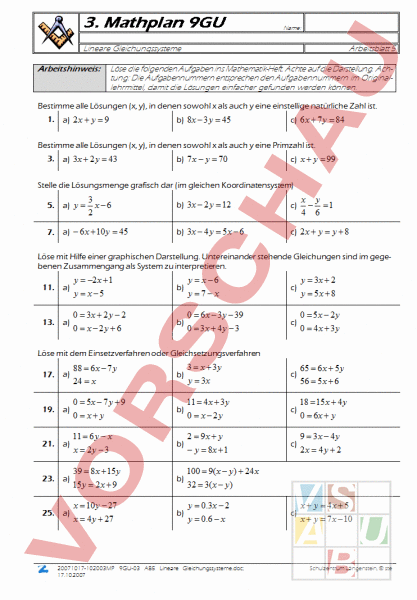 3. Mathplan 9GU Name: Lineare Gleichungssysteme Arbeitshinweis: Arbeitsblatt 5 Löse die folgenden Aufgaben ins Mathematik-Heft. Achte auf die Darstellung. Achtung: Die Aufgabennummern entsprechen den Aufgabennummern im Originallehrmittel, damit die Lösungen einfacher gefunden werden können. Bestimme alle Lösungen (x, y), in denen sowohl als auch eine einstellige natürliche Zahl ist. 1. a) 2 9 b) 8 3 45 c) 6 7 84 Bestimme alle Lösungen (x, y), in denen sowohl als auch eine Primzahl ist. 3. a) 3 2 43 b) 7 70 c) 99 Stelle die Lösungsmenge grafisch dar (im gleichen Koordinatensystem) 5. a) 3 x6 2 7. a) 6 10 45 y 1 4 6 b) 3 2 12 c) b) 3 4 5 6 c) 2 8 Löse mit Hilfe einer graphischen Darstellung. Untereinander stehende Gleichungen sind im gegebenen Zusammengang als System zu interpretieren. 11. a) 13. a) 2 1 b) x5 0 3x 2 2 b) 0 x 2y 6 x6 7x 0 6 3 39 0 3x 4 3 c) c) 3x 2 5x 8 0 5x 2 0 4x 3 Löse mit dem Einsetzverfahren oder Gleichsetzungsverfahren 17. a) 19. a) 21. a) 23. a) 25. a) 88 6 7 24 x b) 0 5x 7 9 b) 0 x 11 6 b) 2y 3 39 8 15 b) 15 2 9 10 27 b) 4 27 20071017-102003MP 17.10.2007 9GU-03 AB5 Lineare 3 x 3y 3x 11 4 3 0 x 2y 2 9x y 8x 1 c) c) c) 65 6 5 56 5 6 18 15 4 0 6x y 9 3x 4 2x 4 2 100 9( ) 24 32 3( ) 0 .3 2 0 .6 Gleichungssysteme.doc; c) 4x 5 7 10 Schulzentrum Längenstein, ste Schulzentrum Längenstein Arbeitsblatt Löse mit dem Additions- oder Subtraktionsverfahren 29. a) 31. a) 33. a) 35. a) 37. a) 41. a) 26 b) x 8 4 9x 2 b) 29 11x y 8x 7 1 b) 2 3 11 5x 6 3 b) 7 8 4 14 15 10 0 b) 21x 10 65 0 x 2 b) 3x 2 3 4 x 5y 5 x 2y 15 4 9 19 2 7 2 9x 5 4 12 7 4x 6 5 6 9 8 0 11x 75 0 9 100 3y 2 4 c) c) c) c) c) c) 3y 2 2 0 4 7 34 0 2x 7 4 0 4 12 0 x 3y 8 4x 5 6 0 5x 6 7 0 4x 6 5 6 9 7 .5 3 26 100 10 39 82 2y 2 x 2 Wähle selbst einen Lösungsweg 43. a) 4 19 y 20 b) 5 2 126 45. a) 5 7 9 y 47. a) 49.* a) b) 4( 2) 5 3 3 50 6 5 2 10 3 2 x 5)( 2) ( 2)( 1) x 4)( 7) ( 3)( 4) 1 5 x 5 4 6 b) 4 11 5 1 .3 1 .2 6 .2 1 .7 0 .8 5 .8 4y 10 2 3 51.* a) x 5 2 9GU-03 2x 5 8 c) b) 4 7 8 2 5 3(2 3) 2 7 20071017-102003MP 17.10.2007 20 50 29 2x 3 6 c) 1 1 1 x 2 3 6 7( ) 4 .8 11 4 b) 7( ) 3 2 .4 11 4 AB5 Lineare Gleichungssysteme.doc; Schulzentrum Längenstein, ste Schulzentrum Längenstein Arbeitsblatt Textaufgaben: Textaufgaben: Die Aufgaben sind mit Hilfe von zwei Lösungsvariablen zu lösen Die Summe zweier gesuchter Zahlen ist zehnmal so gross wie ihre Differenz, die Summe ih87. rer reziproken Werte aber zehnmal so gross wie das Produkt ihrer reziproken Werte. Bestimme die beiden Zahlen. Addiert man zu Zähler und Nenner eines Bruches je 3, so erhält er den Wert 0.3; subtrahiert 89. man stattdessen von Zähler und Nenner je 2, so erhält er den Wert 0.2. Berechne den ursprünglichen Zähler und den ursprünglichen Nenner. 91. Zwei Ziffern bilden eine natürliche Zahl, die viermal so gross ist wie ihre Quersumme und um 9 kleiner als ihre Spiegelzahl. Bestimme die beiden Ziffern. 93. Vor 5 Jahren war der Vater 5-mal so alt wie der Sohn. In 3 Jahren wird er 3-mal so alt sein wie der Sohn. Wie alt sind die beiden jetzt? 95. Adam hat doppelt so viele Brüder wie Schwestern. Seine Schwester Eva hat dreimal so viele Brüder wie Schwestern. Wie viele Kinder haben die Eltern von Adam und Eva? In einer Kasse sind 75 Franken in lauter Zweifränklern und Fünflibern. Ersetzt man jeden Zweifränkler durch eine Zehnernote und zugleich jeden Fünfliber durch eine Zwanzigerno97. te, so ergibt sich dieselbe Wertzunahme, wie wenn man die Anzahl der Fünfliber auf 60 erhöht. Wie viele Münzen von jeder Sorte sind am Anfang in der Kasse? Ein Kapital wird zu 4% verzinst, ein anderes zu 5%. Die summe der beiden Jahreszinsen be101 trägt Fr. 1410.-. Wird nach einem Jahr jeder Zins zu seinem Kapital geschlagen, so werden die beiden Kapitalien gleich gross. Wie gross waren sie am Anfang? Herr Meier hat ein Kapital in zwei Posten angelegt, einen zu 4% und einen zu 5%. Nach sei103 ner Rechnung beträgt die Summe der Jahreszinsen Fr. 2480.- Das sind aber Fr. 80.- zu we* nig; er hat nämlich die Zinssätze verwechselt. Wie gross sind die beiden Posten? 105 Zwei Pralinensorten kosten Fr. 14.40 und Fr. 18.40 pro 250g. Wie viele Gramm jeder Sorte sollte es in einem 250g-Päcklein haben, das Fr. 17.- kostet? Wenn man 90g einer Goldsorte mit 60g einer zweiten Sorte legiert, so erhält man Gold mit 107 der Feinheit 805. Legiert man aber 20g der ersten Sorte mit 100g der zweiten, so hat die Le* gierung die Feinheit 675. Welche Feinheit besitzt jede Sorte? (Feinheit f: auf 1000 Gewichtsteile kommen Gewichtsteile Feingold) Messing ist eine Legierung von Kupfer (8.9 g/cm3 und Zink (7.2 g/cm3 ). Wie viele Gramm 109 Kupfer und Zink sind in 100g Messing mit der Dichte 8.2 g/cm3 enthalten, wenn die Volu* menverminderung beim Legieren nicht berücksichtigt wird? (Runde das Ergebnis auf ganze Gramm) 111 Es sollen Liter 55%iger Spiritus hergestellt werden, wobei eine 35%ige und eine 85%ige Sorte zur Verfügung stehen. Wie viele Liter von jeder Sorte muss man nehmen? Ein Autofahrer legt eine 62 km lange Strecke in einer Stunde zurück. Auf dem Autobahnteil113 stück kann er eine mittlere Geschwindigkeit von 90 km/h einhalten, auf dem Rest der Stre* cke eine solche von 50 km/h. Wie lang ist das Autobahnteilstück und wie lang der Rest der Strecke? 20071017-102003MP 17.10.2007 9GU-03 AB5 Lineare Gleichungssysteme.doc; Schulzentrum Längenstein, ste