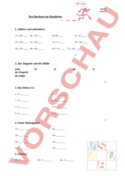 Name: Datum: Test Rechnen im Hunderter 1. Addiere und subtrahiere 57 20 26 70 6520 43 – 6 27 50 76 20 74 – 9 43 – 16 56 26 48 28 63 37 72 18 /9 2. Das Doppelte und die Hälfte Zahl das Doppelte die Hälfte 30 32 48 52 /8 3. Das kleine 1x1 3 8 8 6 7 8 6 6 3 4 4 9 9 4 9 9 /8 4. Finde Malaufgaben 12 81 24 49 14 36 42 54 5. Division 24 3 28 7 36 4 /8 Name: Datum: 24 4 42 7 24 6 24 8 56 7 63 7 36 6 36 9 36 3 12 6. Zeichne den Geldbetrag in Noten und Münzen 65 Fr. 60.50 Fr. 7. Erstelle ein Preisliste Coca-Cola 1 2 3 4 5 Preis 1.10 /4 Du hast Punkte von 49 Punkten. Note: Unterschrift:
