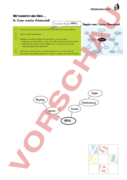 Abfallunterricht Mir kommt in den Sinn . Ein Cluster erstellen (Arbeitstechnik) In unserem Beispiel: ABFALL Beispiele eines Clusters (Ideennetzes): Gefahr Recycling Verschmutzung trennen Umwelt ABFALL