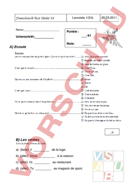 FranzösischTest Unité 14 Name: Lernziele 1/2/4, Punkte Unterschrift:_ A) Ecoute Note: 29.03.2011/41 /6 B) Les verbes Ecris la forme correcte du verbe. a) (faire) Il de la luge. b) (aller) Nous à la maison. c) (être) Ils au restaurant. d) (aller) Tu au magasin de sport. e) (avoir) Vous un snowboard. f) (être) Je à la piscine couverte. g) (avoir) Nous un chat. h) (faire) Nous de la luge. i) (aller) Elles à la poste. j) (faire) Tu du snowboard. 10 C) Questions 15 D) Sätze bilden Bilde mit den Satzelementen sinnvolle Sätze. Beginne den Satz mit dem unterstrichenen Satzteil. Devant patinoire/ restaurant/ il a/le la. souris en forme/ de est/ Carole/ le bonnet/ de/sur la tête. vous alors prenez quest-ce que soleil/ Adrien/ lunettes de/porte/des. jouer viens/ chez moi tu de hockey Il a à un match la télé. /6 E) Au restaurant höre das Gespräch im Restaurant und unterstreiche, was die Dame bestellt. /4