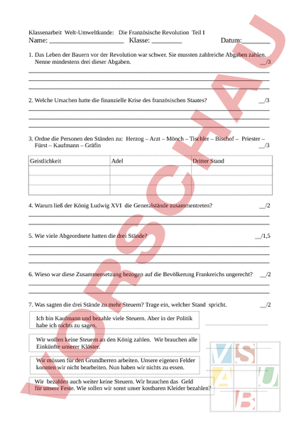 Klassenarbeit Welt-Umweltkunde: Die Französische Revolution Teil Name: Klasse: Datum: 1. Das Leben der Bauern vor der Revolution war schwer. Sie mussten zahlreiche Abgaben zahlen. Nenne mindestens drei dieser Abgaben. /3 2. Welche Ursachen hatte die finanzielle Krise des französischen Staates? /3 3. Ordne die Personen den Ständen zu: Herzog – Arzt – Mönch – Tischler – Bischof – Priester – Fürst – Kaufmann – Gräfin /3 Geistlichkeit Adel Dritter Stand 4. Warum ließ der König Ludwig XVI die Generalstände zusammentreten? /2 5. Wie viele Abgeordnete hatten die drei Stände? /1,5 6. Wieso war diese Zusammensetzung bezogen auf die Bevölkerung Frankreichs ungerecht? /2 7. Was sagten die drei Stände zu mehr Steuern? Trage ein, welcher Stand spricht. Ich bin Kaufmann und bezahle viele Steuern. Aber in der Politik habe ich nichts zu sagen. Wir wollen keine Steuern an den König zahlen. Wir brauchen alle Einkünfte unserer Klöster. Wir müssen für den Grundherren arbeiten. Unsere eigenen Felder konnten wir nicht bearbeiten. Nun haben wir nichts zu essen. Wir bezahlen auch weiter keine Steuern. Wir brauchen das Geld für unsere Feste. Wie sollen wir sonst unser kostbaren Kleider bezahlen? /2 Klassenarbeit Welt-Umweltkunde: Die Französische Revolution Teil Name: Klasse: Datum: 8. Nachdem die Abgeordneten des dritten Standes sich zur Nationalversammlung erklärt hatten, ließ der König den Sitzungssaal schließen. Was unternahmen die Abgeordneten dann? /2 9. Der Nationalfeiertag in Frankreich ist der 14. Juli. Was geschah im Jahr 1789 an diesem Tag in Paris und wodurch wurde das Ereignis ausgelöst? /3 10. Nicht nur in Paris wurde gekämpft. Was geschah auf dem Lande? /2 11. Ein wichtiger Beschluss der Nationalversammlung im August 1789 war die Abschaffung der Vorrechte des Adels. Nenne drei Beispiele für solche Vorrechte. /3 12. Ebenfalls im August wurde die Erklärung der Menschenrechte verabschiedet. Nenne drei Menschenrechte. /3 13. Welche Bedeutung haben diese Menschenrechte heute? /2 Du hast Punkte von 31,5 Punkten erreicht. Damit bekommst du die Note
