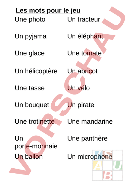 Les mots pour le jeu Une photo Un tracteur Un pyjama Un éléphant Une glace Une tomate Un hélicoptère Un abricot Une tasse Un vélo Un bouquet Un pirate Une trotinette Une mandarine Un porte-monnaie Une panthère Un ballon Un microphone