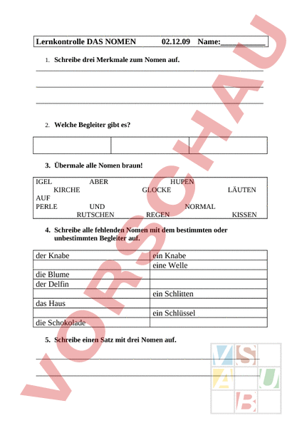 Lernkontrolle DAS NOMEN 02.12.09 Name:_ 1. Schreibe drei Merkmale zum Nomen auf. 2. Welche Begleiter gibt es? 3. Übermale alle Nomen braun! IGEL ABER KIRCHE AUF PERLE UND RUTSCHEN HUPEN GLOCKE LÄUTEN NORMAL REGEN KISSEN 4. Schreibe alle fehlenden Nomen mit dem bestimmten oder unbestimmten Begleiter auf. der Knabe ein Knabe eine Welle die Blume der Delfin ein Schlitten das Haus ein Schlüssel die Schokolade 5. Schreibe einen Satz mit drei Nomen auf. 6. Unterstreiche alle Nomen im Text. der esel auf der weide grast ein esel. die kinder schauen den esel an und möchten den kopf streicheln. sie rufen und halten dem esel einen apfel hin. er schaut auf. nun springt er zu den kindern. sie freuen sich und streicheln den esel. 7. Schreibe die fehlenden Worte in die Tabelle. Einzahl die Hand der Traum Mehrzahl die Krüge die Hunde die Rose der Trichter die Banane 8. Schreibe zusammengesetzte Nomen. Zirkus turnen Band rutschen Tuch Regen Zelt Halle Hals Bahn Tisch Schirm 9. Schreibe Oberbegriffe und je ein Beispiel. Gabel Löffel Turnen Rechnen Punkte:_ Note:_ Unterschrift Eltern: Hammer Zange Banane Orange