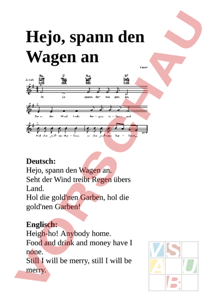 Hejo, spann den Wagen an Deutsch: Hejo, spann den Wagen an. Seht der Wind treibt Regen übers Land. Hol die goldnen Garben, hol die goldnen Garben! Englisch: Heigh-ho! Anybody home. Food and drink and money have none. Still will be merry, still will be merry.