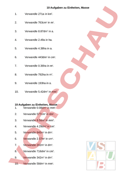 10 Aufgaben zu Einheiten, Masse 1. Verwandle 271a in km2. 2. Verwandle 763cm2 in m2. 3. Verwandle 8.87dm2 in a. 4. Verwandle 2.49a in ha. 5. Verwandle 4.38ha in a. 6. Verwandle 443dm2 in cm2. 7. Verwandle 0.36ha in m2. 8. Verwandle 792ha in m2. 9. Verwandle 193ha in a. 10. Verwandle 5.42dm2 in mm2. 10 Aufgaben zu Einheiten, Masse 1. Verwandle 0.08dm3 in mm3. 2. Verwandle 577cm3 in dm3. 3. Verwandle 8.5dm3 in mm3. 4. Verwandle 4.29dm3 in cm3. 5. Verwandle 845m3 in dm3. 6. Verwandle 2.57m3 in cm3. 7. Verwandle 202m3 in dm3. 8. Verwandle 716dm3 in cm3. 9. Verwandle 342m3 in dm3. 10. Verwandle 58dm3 in mm3. 20 Aufgaben zu Einheiten, Masse 1. Verwandle 3.72l in cm3. 2. Verwandle 3.23hl in cm3. 3. Verwandle 9.03l in dm3. 4. Verwandle 285ml in cm3. 5. Verwandle 528ml in m3. 6. Verwandle 5.48cm3 in ml. 7. Verwandle 182dm3 in dl. 8. Verwandle 502cm3 in dl. 9. Verwandle 92l in cm3. 10. Verwandle 12m3 in l. 11. Verwandle 0.98cm3 in ml. 12. Verwandle 602cl in cm3. 13. Verwandle 855dl in dm3. 14. Verwandle 0.46hl in dm3. 15. Verwandle 9.24mm3 in ml. 16. Verwandle 7.54hl in cm3. 17. Verwandle 57cl in dm3. 18. Verwandle 2.71m3 in hl. 19. Verwandle 5.46cm3 in cl. 20. Verwandle 687m3 in dl. 10 Aufgaben zu Einheiten, Masse 1. Verwandle 271a in km2. 271a 0.0271km2 2. Verwandle 763cm2 in m2. 763cm2 0.0763m2 3. Verwandle 8.87dm2 in a. 8.87dm2 0.000887a 4. Verwandle 2.49a in ha. 2.49a 0.0249ha 5. Verwandle 4.38ha in a. 4.38ha 438a 6. Verwandle 443dm2 in cm2. 443dm2 44300cm2 7. Verwandle 0.36ha in m2. 0.36ha 3600m2 8. Verwandle 792ha in m2. 792ha 7920000m2 9. Verwandle 193ha in a. 193ha 19300a 10. Verwandle 5.42dm2 in mm2. 5.42dm2 54200mm2 10 Aufgaben zu Einheiten, Masse 1. Verwandle 0.08dm3 in mm3. 0.08dm3 80000mm3 2. Verwandle 577cm3 in dm3. 577cm3 0.577dm3 3. Verwandle 8.5dm3 in mm3. 8.5dm3 8500000mm3 4. Verwandle 4.29dm3 in cm3. 4.29dm3 4290cm3 5. Verwandle 845m3 in dm3. 845m3 845000dm3 6. Verwandle 2.57m3 in cm3. 2.57m3 2570000cm3 7. Verwandle 202m3 in dm3. 202m3 202000dm3 8. Verwandle 716dm3 in cm3. 716dm3 716000cm3 9. Verwandle 342m3 in dm3. 342m3 342000dm3 10. Verwandle 58dm3 in mm3. 58dm3 58000000mm3 20 Aufgaben zu Einheiten, Masse 1. 2. Verwandle 3.72l in cm3. 3.72l 3720cm3 Verwandle 3.23hl in cm3. Verwandle 9.03l in dm3. Verwandle 285ml in cm3. Verwandle 528ml in m3. Verwandle 5.48cm3 in ml. Verwandle 182dm3 in dl. Verwandle 502cm3 in dl. Verwandle 92l in cm3. Verwandle 12m3 in l. 3.23hl 323000cm3 9.03l 9.03dm3 285ml 285cm3 528ml 0.000528m3 5.48cm3 5.48ml 182dm3 1820dl 502cm3 5.02dl 92l 92000cm3 12m3 12000l 11. Verwandle 0.98cm3 in ml. 0.98cm3 0.98ml 12. Verwandle 602cl in cm3. 602cl 6020cm3 13. Verwandle 855dl in dm3. 855dl 85.5dm3 14. Verwandle 0.46hl in dm3. 0.46hl 46dm3 15. Verwandle 9.24mm3 in ml. 9.24mm3 0.00924ml 16. Verwandle 7.54hl in cm3. 7.54hl 754000cm3 17. Verwandle 57cl in dm3. 57cl 0.57dm3 18. Verwandle 2.71m3 in hl. 2.71m3 27.1hl 19. Verwandle 5.46cm3 in cl. 5.46cm3 0.546cl 3. 4. 5. 6. 7. 8. 9. 10. 20. Verwandle 687m3 in dl. 687m3 6870000dl