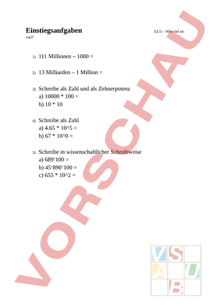 Einstiegsaufgaben viel? 1) 111 Millionen – 1000 2) 13 Milliarden – 1 Million 3) Schreibe als Zahl und als Zehnerpotenz a) 10000 100 b) 10 10 4) Schreibe als Zahl a) 4.65 105 b) 67 100 5) Schreibe in wissenschaftlicher Schreibweise a) 689‘100 b) 45‘890‘100 c) 655 102 LU5 – Wie viel ist uLösungen 1) 111 Millionen – 1000 110‘999‘000 2) 13 Milliarden – 1 Million 12‘999‘000‘000 3) Schreibe als Zahl und als Zehnerpotenz a) 10000 100 1‘000‘000 106 b) 10 10 100 102 4) Schreibe als Zahl a) 4.65 105 b) 67 100 5) 465‘000 67 Schreibe in wissenschaftlicher Schreibweise a) 689‘100 6.891 105 b) 45‘890‘100 4.589901 107 c) 655 102 6.55 104