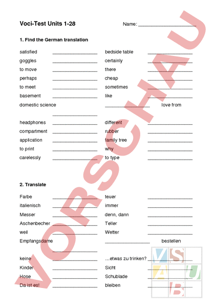 VociTest Units 128 Name: 1. Find the German translation satisfied bedside table goggles certainly to move there perhaps cheap to meet sometimes basement like domestic science love from headphones different compartment rubber application family tree to print why carelessly to type Farbe teuer italienisch immer Messer denn, dann Aschenbecher Teller weil Wetter 2. Translate Empfangsdame bestellen keine etwas zu trinken? Kinder Sicht Hose Schublade Da ist es! bleiben pro anschauen jetzt einladen aufhören viele oft Fahrausweis aufstehen Adresse erzählen berühmt nötig Himmel ausgeben Leute Bahnsteig Reise gegenüber sparen neblig einsam später unglücklich besser als Mannschaft südlich Pech still wieder Wohnzimmer bevor Grosseltern Jugendliche(r) jemals schrecklich versprechen fahren gestern geben vielleicht sehen langweilig machen geboren verlassen Jahrhundert Unterschrift Kunst geradeaus sterben Familienname Gegenwart unmöglich jemand hervorragend geniessen Herbst Sonnenbrille Januar Versuchen Meinung Handschuhe Pflanze Ausgang zu viel nagelneu Fleisch zu Fuss Durcheinander abschliessen Jupe entscheiden Darf ich? deutlich Fluss Halstuch normalerweise zweimal wenig 3. Translate these sentences 1. Der Tennisplatz ist überfüllt. 2. Wir haben einige Pflanzen und Bilder neben dem Fenster. 3. Ich bin nicht sehr stark im Malen. 4. Für Dinge, die nötig sind, gebe ich viel Geld aus. 5. Erinnerst du dich an deine Enkelin? 6. Wo sollen wir uns treffen? 7. Er ist gerade am stricken. Es ist kalt und bewölkt draussen. 8. Es hat Zigaretten, Spiegel und Würmer auf dem Tisch.
