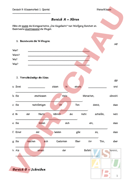 Deutsch 9: Klassenarbeit 1. Quartal Name/Klasse: Bereich – Hören Höre dir zuerst die Kurzgeschichte „Die Kegelbahn von Wolfgang Borchert an. Beantworte anschliessend die Fragen. 1. Beantworte die W-Fragen: /4P Wer? Wann? Wo? Was? 2. Vervollständige die Sätze. /8P a. Zwei sitzen in einem und . b. Sie erschiessen viele Menschen, obwohl. c. Sie rechtfertigen ihr Tun damit, dass. d. In der Nacht können sie nicht schlafen, weil. e. Sie bilden sich ein, dass . f. Einer der beiden gibt zu, dass. g. Sie machen sich Gedanken über ihr Tun, aber. h. Als erneut der Befehl kommt,. Bereich – Schreiben 1 Deutsch 9: Klassenarbeit 1. Quartal Name/Klasse: Bewertungskriterien: /12P Inhaltsangabe In den vergangenen Tagen und Wochen hast du ein Buch, welches du dir in der Schule ausgesucht hattest, gelesen. Schreibe im Folgenden einen kurzen Text über den Inhalt des Buches (W-Fragen beantworten). Nutze für deinen Text die vorgezogenen Linien auf der nächsten Seite. Überschrift (1) Gliederung (2) Inhalt (2) Sachlichkeit/Sprache (2) W-Fragen beantwortet (2) RS/Gr. (2) Lesbarkeit/Sauberkeit (1) 2 Deutsch 9: Klassenarbeit 1. Quartal Name/Klasse: 3 Deutsch 9: Klassenarbeit 1. Quartal Name/Klasse: Bereich – Leseverstehen /12P Lies zuerst den Text. Dann lies Sie die Aufgaben 1 – 12. Sind die Aussagen richtig oder falsch? Kreuze an. Aussage 1. Susanne wollte eigentlich Englischlehrerin werden. 2. Sie hat ein Praktikum in New York gemacht. 3. Sie lebt heute in New York. 4. Susanne hat ihr Studium abgeschlossen. 5. Sie ist heute bei einer deutschen Zeitung angestellt. 6. Sie schreibt meistens über Musik. 7. Susanne schreibt Reiseberichte. 8. Sie hat keinen festen Vertrag. 9. Sie schreibt über die New Yorker Filmszene. 10. Susanne hat eine CD veröffentlicht. 11. Sie verdient heute sehr wenig Geld. 12. Sie fühlt sich selbständig und frei. richtig falsch 4 Deutsch 9: Klassenarbeit 1. Quartal Name/Klasse: Bereich – Sprachbetrachtung Lies dir den folgenden Text durch und bearbeite anschliessend die Aufgaben. A) B) C) D) E) F) G) H) I) J) Die Klasse darf ihre Abschlussfeier im Clubhaus veranstalten. Sie soll grossartig und besser als alle früheren Feiern werden. Jasko und Lilly werden mit ihrer Band für Musik sorgen. Neben der Bühne werden die Tische aufgebaut. Maik möchte Blumen auf die Tische stellen. Hannah kann tolle Fotos mit ihrer neuen Kamera machen. Thomas will sich um das Buffet kümmern. Alle sind Thomas dankbar dafür. Für die Party im letzten Jahr organisierte Ursina leckeren Kuchen. Dieses Jahr hat sie Jan gefragt, ob er eine Torte backen kann. 1. Schreibe die Zeitformen der folgenden Sätze auf: /4P A) C) I) J) 2. Setze die Sätze in die angegebenen Zeitformen: /3P A) Präteritum: C) Präsens: H) Futur I: 3. Welcher der ersten 4 Sätze steht im Passiv? – Satz: /1P 4. Formuliere den Satz so um, dass er im Aktiv steht. /1P Bewertung der Klassenarbeit Bereich Hören 6 12P, 5.5 11P, 5 9P, 4.5 8P, 4 7P, 3.5 6P, 3 5P, 2.5 3P, 2 2P /12P Note: Bereich Schreiben 6 12P, 5.5 11P, 5 9P, 4.5 8P, 4 7P, 3.5 6P, 3 5P, 2.5 3P, 2 2P /12P Note: Bereich Lesen 6 12P, 5.5 11P, 5 9P, 4.5 8P, 4 7P, 3.5 6P, 3 5P, 2.5 3P, 2 2P /12P Note: Bereich Sprachbe. /09P Note: 6 9P, 5.5 8P, 5 7P, 4.5 6P, 4 5, 3.5 4P, 3 3P, 2.5 2P, 2 1P Unterschrift der Eltern: 5