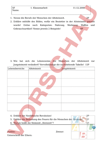 5F Name: 1. Klassenarbeit 11.12.2008 1. Nenne die Berufe der Menschen der Altsteinzeit. 2P 2. Erkläre mithilfe des Bildes, wofür ein Beutetier in der Altsteinzeit genutzt wurde! Ordne nach Kategorien: Nahrung, Werkzeug, Gebrauchsartikel! Nenne jeweils 2 Beispiele! 3. Wie hat sich die Lebensweise der Waffen 8P Menschen der Altsteinzeit Jungsteinzeit verändert? Vervollständige die nachstehende Tabelle! 15P Lebensbereiche Altsteinzeit Jungsteinzeit 4. Erkläre die Neolithische Revolution! 2P 5. Erkläre die Bedeutung des Feuers für die Menschen der Steinzeit! 2P 6. Warum heißt die Steinzeit „Steinzeit? 1P Punkte: Unterschrift der Eltern: und Zensur: zur