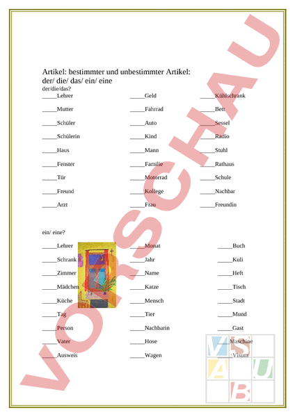 Artikel: bestimmter und unbestimmter Artikel: der/ die/ das/ ein/ eine der/die/das?LehrerGeldKühlschrankMutterFahrradBettSchülerAutoSesselSchülerinKindRadioHausMannStuhlFensterFamilieRathausTürMotorradSchuleFreundKollegeNachbarArztFrauFreundin ein/ eine?LehrerMonatBuchSchrankJahrKuliZimmerNameHeftMädchenKatzeTischKücheMenschStadtTagTierMundPersonNachbarinGastVaterHose MaschineAusweisWagenVisum