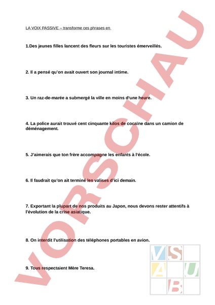 LA VOIX PASSIVE – transforme ces phrases en 1.Des jeunes filles lancent des fleurs sur les touristes émerveillés. 2. Il pensé quon avait ouvert son journal intime. 3. Un raz-de-marée submergé la ville en moins d‘une heure. 4. La police aurait trouvé cent cinquante kilos de cocaïne dans un camion de déménagement. 5. Jaimerais que ton frère accompagne les enfants à l‘école. 6. Il faudrait quon ait terminé les valises dici demain. 7. Exportant la plupart de nos produits au Japon, nous devons rester attentifs à lévolution de la crise asiatique. 8. On interdit lutilisation des téléphones portables en avion. 9. Tous respectaient Mère Teresa.