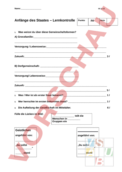 Name: 05.12.12 Anfänge des Staates – Lernkontrolle 1. Punkte /50 Note Was weisst du über diese Gemeinschaftsformen? A) Grossfamilie: Versorgung Lebensweise: Zukunft: 3 B) Dorfgemeinschaft: Versorgung/ Lebensweise: Zukunft: 3 2. Was Wer ist als erster Staat bekannt? 1 3. Wer herrschte im ersten bekannten Staat? 1 4. Die Aufteilung der Gesellschaft im Mittelalter. Fülle die Lücken im Bild: 6/ teilt die Menschen in Gruppen ein Geistlichen angeführt von: angeführt von: „Du sollst „Du sollst stand stand 5. Was bedeutet der Begriff Absolutismus? „Du sollst 1 6. Heiratspolitik A) Warum werden „politische Ehen geschlossen? 1/ B) Was sind die familiären und menschlichen Konsequenzen dieser Ehen? 1 7. Aussenpolitik A) Welche Aussenpolitik betrieb Ludwig XIV? 1/ B) Welche Folgen hat diese Politik? 1/ 8. Steuern A) Wer musste in Frankreich zur Zeit des Absolutismus Steuern bezahlen? 1 B) 9. Wer war davon befreit? 1 Die Aufklärung brachte eine Wendung im Denken! Was bedeuten die folgenden Begriffe in Zusammenhang mit der Aufklärung? A) Mündigkeit: 1 B) Fortschritt (2 Bsp): 2 C) Lebenserwartung: 1 D) Volk: 1 E) Menschenrechte (3 Bsp): 3 F) 3 Staatsgewalten: 3 10. Der französische König Ludwig XVI. musste 1789 feststellen, dass sein Staat kurz vor dem Bankrott stand: Also berief der König die Generalstände ein, damit diese eine breit abgestützte Lösung finden würden. Die beratenden Volksvertreter König hatten folgende Ziele: 7/ Wer? Ziele, Ideen 1. Stand Geistliche 2. Stand Adlige 3. Stand wohlhabende, städtische Bürger Sansculottes 11. Bauern König Weshalb ist der 14.Juli 1789 der heutige Nationalfeiertag von Frankreich? 1/ Kreuze an: Der König behält alle Staatsgewalt bei sich. Der Sturm auf die Bastille wird zum Symbol für die französische Revolution. Die Staatsschulden werden alle zurückbezahlt, somit wird das Staatsbankrott verhindert. 12. Frankreich wird unabhängig vom Fränkischen Reich. Der Staat heute – Schweiz 9/ A) Auf welche 3 Ebenen sind die B) Nenne je 2 Aufgaben der verschiedenen staatlichen Aufgaben aufgeteilt? Ebenen: z.B. Strassenbau 13. Was sind indirekte Steuern? (1 Bsp.) 1/