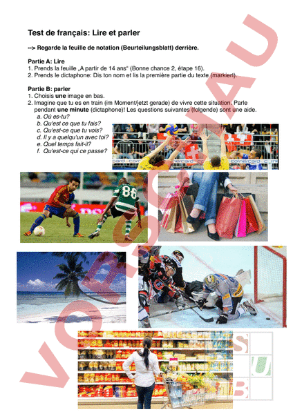 Test de français: Lire et parler -- Regarde la feuille de notation (Beurteilungsblatt) derrière. Partie A: Lire 1. Prends la feuille „A partir de 14 ans (Bonne chance 2, étape 16). 2. Prends le dictaphone: Dis ton nom et lis la première partie du texte (markiert). Partie B: parler 1. Choisis une image en bas. 2. Imagine que tu es en train (im Moment/jetzt gerade) de vivre cette situation. Parle pendant une minute (dictaphone)! Les questions suivantes (folgende) sont une aide. a. Où es-tu? b. Qu‘est ce que tu fais? c. Qu‘est-ce que tu vois? d. Il a quelqu‘un avec toi? e. Quel temps fait-il? f. Qu‘est-ce qui ce passe?