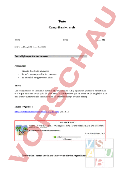 C`est un teste qui concerne un sujet de l`étape 31: les vacances. C`est un document authentique ou on entend des collegien français qui parlent des leurs vacances.