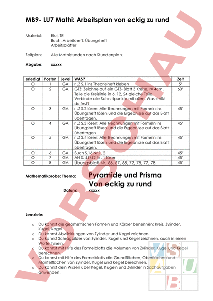 MB9- LU7 Mathi: Arbeitsplan von eckig zu rund Material: Etui, TR Buch, Arbeitsheft, Übungsheft Arbeitsblätter Zeitplan: Alle Mathistunden nach Stundenplan. Abgabe: xxxxx erledigt O Posten 1 2 Level GA GA 3 GA 4 GA 5 GA O 6 7 8 GA GA GA WAS? rILZ S.1 ins Theorieheft kleben GTZ: Zeichne auf ein GTZ- Blatt 3 Kreise, r 4cm. Teile die Kreislinie in 6, 12, 24 gleiche Teile. Verbinde alle Schnittpunkte mit allen. Was stellst du fest? rILZ S.2 lösen: Alle Rechnungen mit Formeln ins Übungsheft lösen und die Ergebnisse auf das Blatt übertragen. rILZ S.3 lösen: Alle Rechnungen mit Formeln ins Übungsheft lösen und die Ergebnisse auf das Blatt übertragen. rILZ S.4 lösen: Alle Rechnungen mit Formeln ins Übungsheft lösen und die Ergebnisse auf das Blatt übertragen. Buch S.16 Nr.1, 2 AH S. 41/42 Nr. 1 lösen Übungsblatt Nr. 66, 67, 68, 72, 75, 77, 78 Mathematikprobe: Thema: Datum: Zeit 5‘ 60‘ 45‘ 45‘ 45‘ 45‘ 45‘ 45‘ Pyramide und Prisma Von eckig zu rund xxxxx Lernziele: o o o Du kannst die geometrischen Formen und Körper benennen: Kreis, Zylinder, Kugel, Kegel Du kannst Abwicklungen von Zylinder und Kegel zeichnen. Du kannst Schrägbilder von Zylinder, Kugel und Kegel zeichnen, auch in einen Würfel hinein. Du kannst mit Hilfe des Formelblatts die Volumen von Zylinder, Kugel und Kegel berechnen. Du kannst mit Hilfe des Formelblatts die Grundflächen, Oberflächen und Mantelflächen von Zylinder, Kugel und Kegel berechnen. Du kannst dein Wissen über Kegel, Kugeln und Zylinder in Sachaufgaben anwenden.