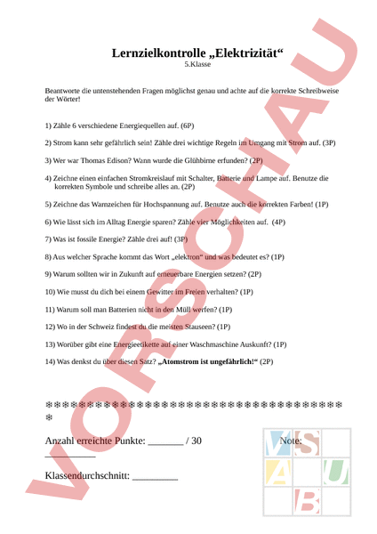 Lernzielkontrolle „Elektrizität 5.Klasse Beantworte die untenstehenden Fragen möglichst genau und achte auf die korrekte Schreibweise der Wörter! 1) Zähle 6 verschiedene Energiequellen auf. (6P) 2) Strom kann sehr gefährlich sein! Zähle drei wichtige Regeln im Umgang mit Strom auf. (3P) 3) Wer war Thomas Edison? Wann wurde die Glühbirne erfunden? (2P) 4) Zeichne einen einfachen Stromkreislauf mit Schalter, Batterie und Lampe auf. Benutze die korrekten Symbole und schreibe alles an. (2P) 5) Zeichne das Warnzeichen für Hochspannung auf. Benutze auch die korrekten Farben! (1P) 6) Wie lässt sich im Alltag Energie sparen? Zähle vier Möglichkeiten auf. (4P) 7) Was ist fossile Energie? Zähle drei auf! (3P) 8) Aus welcher Sprache kommt das Wort „elektron und was bedeutet es? (1P) 9) Warum sollten wir in Zukunft auf erneuerbare Energien setzen? (2P) 10) Wie musst du dich bei einem Gewitter im Freien verhalten? (1P) 11) Warum soll man Batterien nicht in den Müll werfen? (1P) 12) Wo in der Schweiz findest du die meisten Stauseen? (1P) 13) Worüber gibt eine Energieetikette auf einer Waschmaschine Auskunft? (1P) 14) Was denkst du über diesen Satz? „Atomstrom ist ungefährlich! (2P) Anzahl erreichte Punkte: 30 Klassendurchschnitt: Note: Unterschrift: