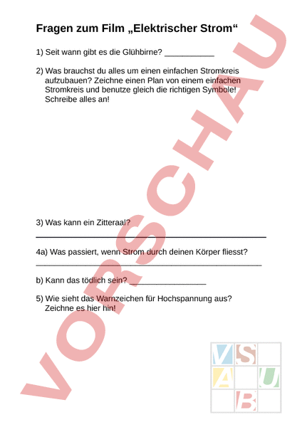 Fragen zum Film „Elektrischer Strom 1) Seit wann gibt es die Glühbirne? 2) Was brauchst du alles um einen einfachen Stromkreis aufzubauen? Zeichne einen Plan von einem einfachen Stromkreis und benutze gleich die richtigen Symbole! Schreibe alles an! 3) Was kann ein Zitteraal? 4a) Was passiert, wenn Strom durch deinen Körper fliesst? b) Kann das tödlich sein? 5) Wie sieht das Warnzeichen für Hochspannung aus? Zeichne es hier hin! 6) Wie heissen die wichtigsten Regeln im Umgang mit Strom? Zähle drei auf! 7) Wie sollst du dich bei einem Gewitter verhalten? 8) Warum wollen viele Menschen keine Atomkraftwerke mehr? 9) Warum ist Energiesparen so wichtig? 10 Wie kannst du Energiesparen? Zähle vier Möglichkeiten, die im Film gezeigt wurden auf!