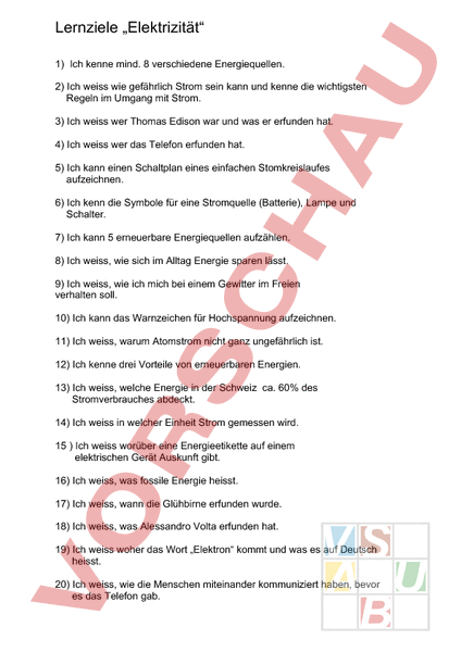 Lernziele „Elektrizität 1) Ich kenne mind. 8 verschiedene Energiequellen. 2) Ich weiss wie gefährlich Strom sein kann und kenne die wichtigsten Regeln im Umgang mit Strom. 3) Ich weiss wer Thomas Edison war und was er erfunden hat. 4) Ich weiss wer das Telefon erfunden hat. 5) Ich kann einen Schaltplan eines einfachen Stomkreislaufes aufzeichnen. 6) Ich kenn die Symbole für eine Stromquelle (Batterie), Lampe und Schalter. 7) Ich kann 5 erneuerbare Energiequellen aufzählen. 8) Ich weiss, wie sich im Alltag Energie sparen lässt. 9) Ich weiss, wie ich mich bei einem Gewitter im Freien verhalten soll. 10) Ich kann das Warnzeichen für Hochspannung aufzeichnen. 11) Ich weiss, warum Atomstrom nicht ganz ungefährlich ist. 12) Ich kenne drei Vorteile von erneuerbaren Energien. 13) Ich weiss, welche Energie in der Schweiz ca. 60% des Stromverbrauches abdeckt. 14) Ich weiss in welcher Einheit Strom gemessen wird. 15 Ich weiss worüber eine Energieetikette auf einem elektrischen Gerät Auskunft gibt. 16) Ich weiss, was fossile Energie heisst. 17) Ich weiss, wann die Glühbirne erfunden wurde. 18) Ich weiss, was Alessandro Volta erfunden hat. 19) Ich weiss woher das Wort „Elektron kommt und was es auf Deutsch heisst. 20) Ich weiss, wie die Menschen miteinander kommuniziert haben, bevor es das Telefon gab.