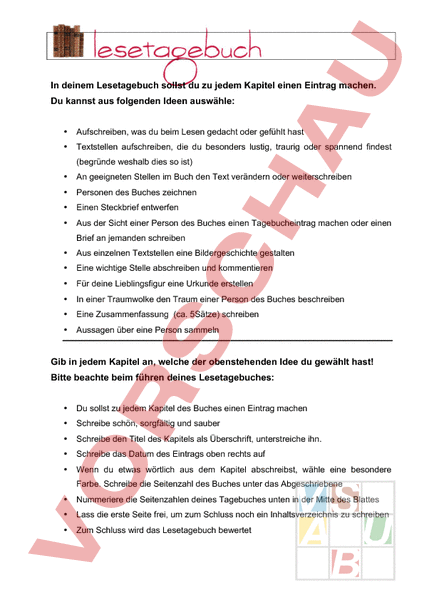 In deinem Lesetagebuch sollst du zu jedem Kapitel einen Eintrag machen. Du kannst aus folgenden Ideen auswähle: • Aufschreiben, was du beim Lesen gedacht oder gefühlt hast • Textstellen aufschreiben, die du besonders lustig, traurig oder spannend findest (begründe weshalb dies so ist) • An geeigneten Stellen im Buch den Text verändern oder weiterschreiben • Personen des Buches zeichnen • Einen Steckbrief entwerfen • Aus der Sicht einer Person des Buches einen Tagebucheintrag machen oder einen Brief an jemanden schreiben • Aus einzelnen Textstellen eine Bildergeschichte gestalten • Eine wichtige Stelle abschreiben und kommentieren • Für deine Lieblingsfigur eine Urkunde erstellen • In einer Traumwolke den Traum einer Person des Buches beschreiben • Eine Zusammenfassung (ca. 5Sätze) schreiben • Aussagen über eine Person sammeln Gib in jedem Kapitel an, welche der obenstehenden Idee du gewählt hast! Bitte beachte beim führen deines Lesetagebuches: • Du sollst zu jedem Kapitel des Buches einen Eintrag machen • Schreibe schön, sorgfältig und sauber • Schreibe den Titel des Kapitels als Überschrift, unterstreiche ihn. • Schreibe das Datum des Eintrags oben rechts auf • Wenn du etwas wörtlich aus dem Kapitel abschreibst, wähle eine besondere Farbe. Schreibe die Seitenzahl des Buches unter das Abgeschriebene • Nummeriere die Seitenzahlen deines Tagebuches unten in der Mitte des Blattes • Lass die erste Seite frei, um zum Schluss noch ein Inhaltsverzeichnis zu schreiben • Zum Schluss wird das Lesetagebuch bewertet