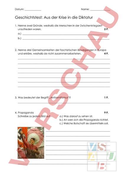 Datum: Name: Geschichtstest: Aus der Krise in die Diktatur 1. Nenne zwei Gründe, weshalb die Menschen in der Zwischenkriegszeit unzufrieden waren. 2 P. a.) b.) 2. Nenne drei Gemeinsamkeiten der faschistischen Bewegungen in Europa und erkläre, weshalb sie nicht zusammenarbeiteten. 4 P. 3. Was bedeutet der Begriff „Antisemitismus? 1 P. 4. Propaganda Schreibe zu jedem Bild auf 9 P. a.) Was darauf zu sehen ist. b.) An wen sich die Propaganda richtet. c.) Welche Botschaft sie übermitteln soll. 5. Die NSDAP a.) Wofür steht die Abkürzung „NSDAP? 1 P. b.) Welche Ziele verfolgte die NSDAP? Nenne drei. 3 P. 6. Deutschland wird zur Diktatur Erkläre, wie Deutschland zur Diktatur wurde. Zeige dabei auf, welche äusseren Einflüsse den Aufstieg Hitlers ermöglichten und wie die NSDAP gegen ihre Gegner vorging. äussere Einflüsse Deutschland wird zur Diktatur 2 P. Punkte: 3 P. Note: so wurden Gegner bekämpft Unterschrift: 2 P.