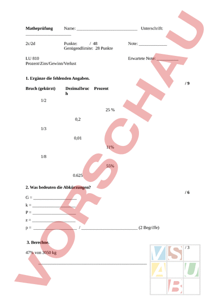 Matheprüfung Name: Unterschrift: 2c/2d Punkte: 48 Genügendlimite: 28 Punkte LU 810 Prozent/Zins/Gewinn/Verlust Note: Erwartete Note: 1. Ergänze die fehlenden Angaben. /9 Bruch (gekürzt) Dezimalbruc Prozent 1/2 25 0,2 1/3 0,01 11% 1/8 55% 0.625 2. Was bedeuten die Abkürzungen? /6 (2 Begriffe) 3. Berechne. /3 47% von 3050 kg 525,6 sind 9% von wie viel m? 1073 Fr. sind x% von 3700 Fr. 4. Löse die Textaufgaben nach Schema. Pro Aufgabe gibt es 3 Punkte 30 1) Von 810 Büchern einer Schulbibliothek sind 567 Bücher ausgeliehen. Wie viel Prozent der Bücher sind das? 2) Frau Tessaro kauft im Ausverkauf ein. 30% RABATT AUF ALLE WAREN. Frau Tessaro kauft einen Pullover, der normalerweise 72 Franken kostet. Wie viel muss Frau Tessaro tatsächlich bezahlen? 3) Im Winterschlussverkauf wird eine Jacke um 25 des ursprünglichen Preises billiger. Sie kostet dann noch 49,50 Euro. Was kostete sie ursprünglich? 4) Herr Steiner hat 7200 Franken auf seinem Konto. Der Zinssatz beträgt 1,3%. Nach einem Jahr möchte Herr Steiner sein Geld wieder abheben. Wie viel erhält er zusätzlich zu seinen 7200 Franken von der Bank? 5) Bei der Tour de Suisse führt eine Etappe von Sierre nach Schwarzenburg über 196km. Das sind 14% der Gesamtstrecke. a. Wie lang ist die Gesamtstrecke? b. Wie lang ist die zweitletzte Etappe die 12% der Gesamtstrecke ausmacht? (Falls du nicht berechnen konntest, nehme 1000 km als Gesamtstrecke.) 6) Leonie hat eine Erbschaft von 64000 Franken gemacht. Leonie erhält im Moment 1360 Franken Zinsen im Jahr. Zu welchem Prozentsatz ist ihr Geld angelegt? 7) Rita muss 1200 Franken Zinsen in einem Jahr an ihre Bank bezahlen. Wie viel Geld hat sie sich insgesamt ausgeliehen, wenn ihr die Bank einen Zinssatz von 3% gibt? 8) Ein Händler (Herr Simon) kauft ein Auto von einem anderen Händler für 25000 Franken. Nachdem er ein paar Sachen repariert hat, kann er es in seinem Autohaus für 30000 Franken verkaufen. Für die Reparatur hat er selbst 1000 Franken bezahlt. a) Wie viel Gewinn macht Herr Simon? b) Wie viel Prozent Gewinn macht Herr Simon?