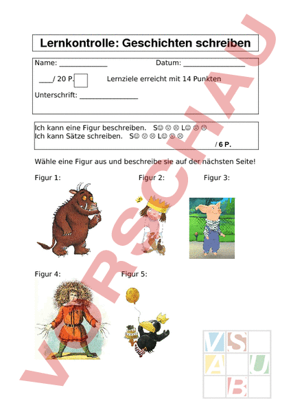 Lernkontrolle: Geschichten schreiben Name: / 20 P. Datum: Lernziele erreicht mit 14 Punkten Unterschrift: Ich kann eine Figur beschreiben. S L Ich kann Sätze schreiben. S L 6 P. Wähle eine Figur aus und beschreibe sie auf der nächsten Seite! Figur 1: Figur 4: Figur 2: Figur 5: Figur 3: Schreibe jeweils 1 Satz. Denke dabei an die Satzzeichen und die Satzanfänge! Gewählte Figur: Nr. Aussehen/Gesichtsausdruck: Gedanken/Gefühle: Können: Wähle dir eine zweite Figur aus. (Diese kannst du am Schluss, falls du noch Zeit hast, auf der Rückseite beschreiben.) Stell dir vor, die beiden Figuren begegnen einander. Überlege dir zuerst folgende Dinge: Wo begegnen sie sich? Wie sieht es dort aus? Was erleben sie? Wie fühlen sie sich? Schreibe nun auf das separate Blatt eine Geschichte. Die Geschichte muss mindestens 5 Sätze lang sein. Sie darf aber auch länger sein! Kriterien: • Satzzeichen richtig gesetzt 2 P. • • Inhalt Wörter sind richtig geschrieben Ich kann eine Geschichte mit mindestens 5 Sätzen schreibenS L Bonus: ( 3 Punkte) 5 P. 2 P. 14 P. 3 P. Beschreibe die 2. Figur die du gewählt hast. Gewählte Figur: Nr. Aussehen/Gesichtsausdruck: Gedanken/Gefühle: Können: