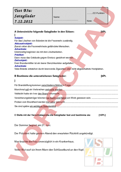 Test B3a: Satzglieder 7.12.2012 /22 Punkten Name: Note: Unterstreiche folgende Satzglieder in den Sätzen: [6Pt. Subjekt: Für das Löschen von Bränden ist die Feuerwehr zuständig. Akkusativobjekt: Zuerst retten die Feuerwehrleute gefährdete Menschen. Adverbiale: Gleichzeitig beginnen sie mit den Löscharbeiten. Prädikat: Dann muss das Gebäude gegen Einsturz gesichert werden. Dativobjekt: Dem Brandermittler ist ein leerer Benzinkanister aufgefallen. Adverbiale: Viele Brände entstehen durch brennende Zigaretten oder nicht abgeschaltete Herdplatten. Bestimme die unterstrichenen Satzglieder: [6Pt. Für Brandstiftung kommen verschiedene Motive in Frage. . Manchmal soll ein Verbrechen vertuscht werden. Vielleicht hatte ein Irrer den Brand verursacht. . Versicherungsbetrüger könnten bei Nacht und Nebel am Werk gewesen sein. Proben vom Brandherd werden ins Labor gebracht Sie sind später ein wichtiges Beweismittel. Stelle mit der Verschiebeprobe die Satzglieder fest und bestimme sie: Der Sommer beginnt am 21. Juni. Der Präsident hatte gestern Abend den erwarteten Rücktritt angekündigt. Man brachte die Frau unverzüglich in ein Krankenhaus. Voller Wut warf sie ihrem Mann den Schlüsselbund an den Kopf. [10Pt.] Wilhelm Tell wollte seinem Sohn Walter helfen. Erleichtert konnte Susie und ihre Freundin nach Hause gehen.