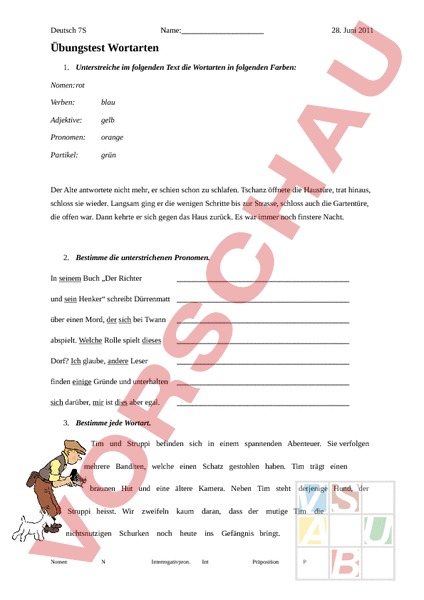 Deutsch 7S Name:_ 28. Juni 2011 Übungstest Wortarten 1. Unterstreiche im folgenden Text die Wortarten in folgenden Farben: Nomen:rot Verben: blau Adjektive: gelb Pronomen: orange Partikel: grün Der Alte antwortete nicht mehr, er schien schon zu schlafen. Tschanz öffnete die Haustüre, trat hinaus, schloss sie wieder. Langsam ging er die wenigen Schritte bis zur Strasse, schloss auch die Gartentüre, die offen war. Dann kehrte er sich gegen das Haus zurück. Es war immer noch finstere Nacht. 2. Bestimme die unterstrichenen Pronomen. In seinem Buch „Der Richter und sein Henker schreibt Dürrenmatt über einen Mord, der sich bei Twann abspielt. Welche Rolle spielt dieses Dorf? Ich glaube, andere Leser finden einige Gründe und unterhalten sich darüber, mir ist dies aber egal. 3. Bestimme jede Wortart. Tim und Struppi befinden sich in einem spannenden Abenteuer. Sie verfolgen mehrere Banditen, welche einen Schatz gestohlen haben. Tim trägt einen braunen Hut und eine ältere Kamera. Neben Tim steht Struppi heisst. Wir zweifeln kaum daran, derjenige Hund, der dass der mutige Tim nichtsnutzigen Schurken noch heute ins Gefängnis bringt. Nomen Interrogativpron. Int Präposition die Deutsch 7S Name:_ Verb Indefinitpron. Ind Adjektiv Personalpron. Per Artikel Art Demonstrativpron. Dem Possessivpron. Pos Relativpron. Rel Reflexivpron. Ref Konjunktion Adverb 28. Juni 2011 Adv