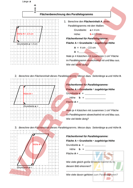 Breite Länge Flächenberechnung des Parallelogramms 1. Berechne den Flächeninhalt eines Parallelogramms mit den Maßen: Höhe 2,5 cm Grundseite: 4 cm Höhe: 2,5 cm Flächenformel für Parallelogramme: Grundseite 4 cm Fläche Grundseite zugehörige Höhe 4 cm 2,5 cm Male je 4 Kästchen mit zusammen 1 cm2 Fläche im Parallelogramm abwechselnd rot und blau aus. Wie viel bleibt übrig? 2. Berechne den Flächeninhalt dieses Parallelogramms. Messe dazu Seitenlänge und Höhe h. Flächenformel für Parallelogramme: Fläche Grundseite zugehörige Höhe Grundseite Höhe Höhe Fläche Grundseite Male je 4 Kästchen mit zusammen 1 cm2 Fläche im Parallelogramm abwechselnd rot und blau aus. Wie viel bleibt übrig? 3. Berechne den Flächeninhalt dieses Parallelogramms. Messe dazu Seitenlänge und Höhe h. Flächenformel für Parallelogramme: Fläche Grundseite zugehörige Höhe Höhe Grundseite Höhe Fläche Wie viele gleich große Dreiecke kannst du in Grundseite diesem Bild erkennen? Wie viele davon gehören zum Parallelogramm?