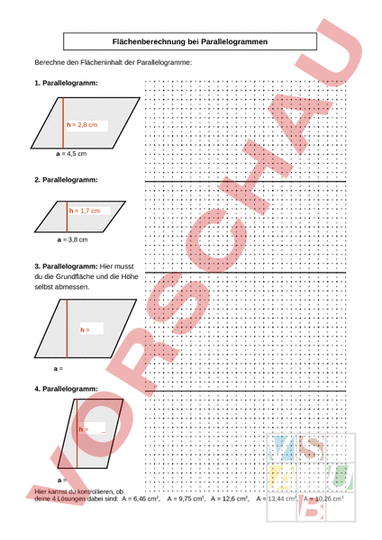 Flächenberechnung bei Parallelogrammen Berechne den Flächeninhalt der Parallelogramme: 1. Parallelogramm: 2,8 cm 4,5 cm 2. Parallelogramm: 1,7 cm 3,8 cm 3. Parallelogramm: Hier musst du die Grundfläche und die Höhe selbst abmessen. h a 4. Parallelogramm: h a Hier kannst du kontrollieren, ob deine 4 Lösungen dabei sind: 6,46 cm2, 9,75 cm2, 12,6 cm2, 13,44 cm2, 10,26 cm2