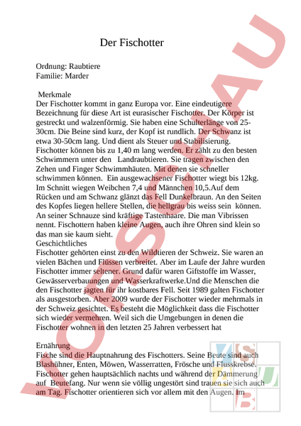 Der Fischotter Ordnung: Raubtiere Familie: Marder Merkmale Der Fischotter kommt in ganz Europa vor. Eine eindeutigere Bezeichnung für diese Art ist eurasischer Fischotter. Der Körper ist gestreckt und walzenförmig. Sie haben eine Schulterlänge von 2530cm. Die Beine sind kurz, der Kopf ist rundlich. Der Schwanz ist etwa 30-50cm lang. Und dient als Steuer und Stabilisierung. Fischotter können bis zu 1,40 lang werden. Er zählt zu den besten Schwimmern unter den Landraubtieren. Sie tragen zwischen den Zehen und Finger Schwimmhäuten. Mit denen sie schneller schwimmen können. Ein ausgewachsener Fischotter wiegt bis 12kg. Im Schnitt wiegen Weibchen 7,4 und Männchen 10,5.Auf dem Rücken und am Schwanz glänzt das Fell Dunkelbraun. An den Seiten des Kopfes liegen hellere Stellen, die hellgrau bis weiss sein können. An seiner Schnauze sind kräftige Tastenhaare. Die man Vibrissen nennt. Fischottern haben kleine Augen, auch ihre Ohren sind klein so das man sie kaum sieht. Geschichtliches Fischotter gehörten einst zu den Wildtieren der Schweiz. Sie waren an vielen Bächen und Flüssen verbreitet. Aber im Laufe der Jahre wurden Fischotter immer seltener. Grund dafür waren Giftstoffe im Wasser, Gewässerverbauungen und Wasserkraftwerke.Und die Menschen die den Fischotter jagten für ihr kostbares Fell. Seit 1989 galten Fischotter als ausgestorben. Aber 2009 wurde der Fischotter wieder mehrmals in der Schweiz gesichtet. Es besteht die Möglichkeit dass die Fischotter sich wieder vermehren. Weil sich die Umgebungen in denen die Fischotter wohnen in den letzten 25 Jahren verbessert hat Ernährung Fische sind die Hauptnahrung des Fischotters. Seine Beute sind auch Blashühner, Enten, Möwen, Wasserratten, Frösche und Flusskrebse. Fischotter gehen hauptsächlich nachts und während der Dämmerung auf Beutefang. Nur wenn sie völlig ungestört sind trauen sie sich auch am Tag. Fischotter orientieren sich vor allem mit den Augen. Im trüben Wasser spüren sie ihre Beute mit den Schnurrbarthaaren auf. Mit diesen Haaren, die bis zu 6cm lang sind kann, der Fischotter die Bewegung des Beutetieres fühlen. Die Schnurrbart dient als Tastorgan. Fortpflanzung Die Paarung findet am Land statt. Sie haben keine feste Paarungszeit deshalb können das ganze Jahr über Welt kommen. Tragezeit eines Weibchens enthält zwischen 58 und 62 Tagen. Nach der Tragezeit kommen meistens 1-3 Jungen selten 4-5. Die Jungtiere sind nach der Geburt blind, wiegen etwa 80-100 und haben eine Körperlänge von über 15cm. Sie öffnen die Augen frühestens an ihrem 31.Lebenstag. Ab der sechsten Lebenswoche finden die ersten Schwimmversuche statt. Manchmal sind die Jungen Wasserscheu dann packt die Mutter ihre Jungen und taucht sie ins Wasser. Die Mutter säugt ihre Jungen zwischen 8 und 14 Wochen. In der Regel bleiben die Jungtiere 14 Monate bei der Mutter, um von ihr die Jagd zu erlernen. Feinde Die Feinde des Fischotters sind Wölfe Luchse der Seeadler sowie frei laufende Hunde. Der gefährlichste Feind ist der Mensch. Durch Zerstörung der Lebensräume und verschmutzen des Wassers und noch vieles mehr. Lebenserwartung Ein Fischotter in Gefangenschaft erreicht so um 22 Jahre. Fischotter in Freiheit erreichen dieses Alter nicht.15% der Jungtiere von einem Jahr werden 3 Jahre alt. Durchschnittlich leben sie 8-13 Jahre. Lebensraum Der Fischotter bewohnt stehende und fliessende Gewässer mit Dicht bewachsenem Ufer wie Seen, Flüsse, Kanäle, Bäche, Teiche, Sumpfgebiete und Moore. Lebensweise Eine einheitliche Lebensweise von Fischottern gibt es nicht, je nach Umgebung passen sie sich ihre Lebensweise an um möglichst gut überleben zu können. Fischotter haben Baue die an der Wasserlinie und an den Wurzeln von Bäumen liegen. Sie nutzen viele verschiedene Verstecke als Schlafplatz etwa alle 1000m haben sie einen Unterschlupf. In denen sie unregelmässig bewohnen und immer wieder wechseln. Der Uferstreifen der Gewässer bilden die Reviere der Fischotter. Jeder Fischotter markiert sein Gebiet mit einem Duftstoff und mit Kot. Die Reviere können bis 50km lang sein. Es kommt drauf an wie viel Nahrung man in dem Gewässer findet. Weil sie gerne nahe beim Wasser bleiben reichen die Reviere nur 100m ins Land hinein. Ein Fischotter kann bis zu 8min unter Wasser bleiben. Dann muss er an die Oberfläche, um Luft zu schnappen. Fischotter tauchen 300m tief und 18m tief. Beim tauchen sind Nase und Ohren verschossen. Im Winter tauchen sie unter Eis. Sie bewegen sich am Land auch sehr schnell. Oft wandern sie bis 20km weit. Wenn sie sich einen Überblick verschaffen wollen, stellen sie sich auf die Hinterbeine.