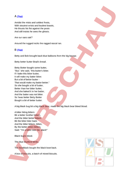 A (Top) Amidst the mists and coldest frosts, With stoutest wrists and loudest boasts, He thrusts his fist against the posts And still insists he sees the ghosts. Are our oars oak? Around the rugged rocks the ragged rascal ran. (Top) Betty and Bob brought back blue balloons from the big bazaar. Betty better butter Brad bread. Betty Botter bought some butter, But, she said, this butter bitter. If bake this bitter butter, It will make my batter bitter. But bit of better butter That would make my batter better. So she bought bit of butter, Better than her bitter butter, And she baked it in her batter, And the batter was not bitter. So twas better Betty Botter Bought bit of better butter. big black bug bit big black bear, made the big black bear bleed blood. bitter biting bittern Bit better brother bittern, And the bitter better bittern Bit the bitter biter back. And the bitter bittern, bitten, By the better bitten bittern, Said: Im bitter biter bit, alack! Black bug blood. The blue bluebird blinks. The bootblack bought the black boot back. box of biscuits, batch of mixed biscuits. Brad big black bath brush broke. (Top) Can you imagine an imaginary menagerie manager imagining managing an imaginary menagerie? Cedar shingles should be shaved and saved. cheap ship trip. Chop shops stock chops. Comical economists. Cows graze in groves on grass which grows in grooves in groves. Crisp crusts crackle crunchily. The crow flew over the river with lump of raw liver. (Top) Dont pamper damp scamp tramps that camp under ramp lamps. dozen double damask dinner napkins. Draw drowsy ducks and drakes. (Top) Ed had edited it. The epitome of femininity. (Top) Fat frogs flying past fast. fat thrush flies through thick fog. Flash message! Flee from fog to fight flu fast! Fred fed Ted bread, and Ted fed Fred bread. Freshly fried flying fish, freshly fried flesh. Friendly Frank flips fine flapjacks. (Top) Gertie great-grandma grew aghast at Gertie grammar. Girl gargoyle, guy gargoyle. Give me the gift of griptop sock: drip-drape, ship-shape, tip-top sock. Give Mr. Snipe wife knife swipe. Good blood, bad blood. Greek grapes. (Top) How much wood would woodchuck chuck If woodchuck could chuck wood? He would chuck, he would, as much as he could, And chuck as much wood as woodchuck would If woodchuck could chuck wood. (Top) cannot bear to see bear Bear down upon hare. When bare of hair he strips the hare, Right there cry, Forbear! can think of six thin things and of six thick things too. correctly recollect Rebecca MacGregor reckoning. If Hottentot taught Hottentot tot To talk ere the tot could totter, Ought the Hottenton tot Be taught to say aught, or naught, Or what ought to be taught her? If to hoot and to toot Hottentot tot Be taught by her Hottentot tutor, Ought the tutor get hot If the Hottentot tot Hoot and toot at her Hottentot tutor? If one doctor doctors another doctor, does the doctor who doctors the doctor doctor the doctor the way the doctor he is doctoring doctors? Or does he doctor the doctor the way the doctor who doctors doctors? If Stu chews shoes, should Stu choose the shoes he chews? Im not the pheasant plucker, Im the pheasant plucker mate. Im only plucking pheasants Cause the pheasant plucker late. Inchworms itching. need not your needles, theyre needless to me; For kneading of noodles, twere needless, you see; But did my neat knickers but need to be kneed, then should have need of your needles indeed. Irish wristwatch. saw Esau kissing Kate. saw Esau, he saw me, and she saw saw Esau. slit the sheet, the sheet slit, and on the slitted sheet sit. Is this your sister sixth zither, sir? thought thought But the thought thought Was not the thought thought thought. (Top) Knapsack straps. Kris Kringle carefully crunched on candy canes. (Top) laurel-crowned clown. The Leith police dismisseth us. Lesser leather never weathered wetter weather better. Lily ladles little Letty lentil soup. Listen to the local yokel yodel. Lovely lemon liniment. (Top) Many an anemone sees an enemy anemone. The minx mixed medicinal mixture. Mixed biscuits. Mix, Miss, Mix! Moose noshing much mush. Mr. See owned saw. And Mr. Soar owned seesaw. Now See saw sawed Soar seesaw Before Soar saw See, Which made Soar sore. Had Soar seen See saw Before See sawed Soar seesaw, See saw would not have sawed Soar seesaw. So See saw sawed Soar seesaw. But it was sad to see Soar so sore Just because See saw sawed Soar seesaw! My dame hath lame tame crane, My dame hath crane that is lame. The myth of Miss Muffet. (Top) Nine nice night nurses nursing nicely. (Top) The ochre ogre ogled the poker. Of all the felt ever felt, never felt piece of felt Which felt as fine as that felt felt, When first felt that felt hat felt. Old oily Ollie oils old oily autos. Once upon barren moor There dwelt bear, also boar. The bear could not bear the boar. The boar thought the bear bore. At last the bear could bear no more Of that boar that bored him on the moor, And so one morn he bored the boar That boar will bore the bear no more. One-One was racehorse; Two-Two was one, too. When One-One won one race, Two-Two won one, too. On mules we find two legs behind And two we find before. We stand behind before we find What those behind be for. (Top) Pacific Lithograph. Peggy Babcock. Peter Piper picked peck of pickled peppers. Did Peter Piper pick peck of pickled peppers? If Peter Piper picked peck of pickled peppers, Where the peck of pickled peppers Peter Piper picked? Pick partner and practice passing, for if you pass proficiently, perhaps youll play professionally. Plague-bearing prairie dogs. pleasant place to place plaice is place where plaice is pleased to be placed. Please pay promptly. Pope Sixtus VI six texts. Preshrunk silk shirts. Pretty Kitty Creighton had cotton batten cat. The cotton batten cat was bitten by rat. The kitten that was bitten had button for an eye, And biting off the button made the cotton batten fly. proper cup of coffee from proper copper coff