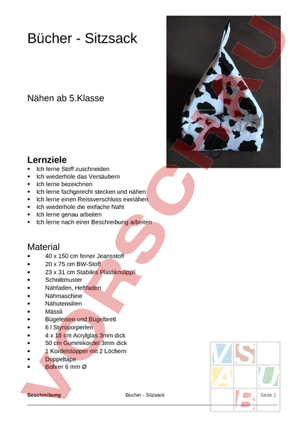 Bücher Sitzsack Nähen ab 5.Klasse Lernziele Ich lerne Stoff zuschneiden Ich wiederhole das Versäubern Ich lerne bezeichnen Ich lerne fachgerecht stecken und nähen Ich lerne einen Reissverschluss einnähen Ich wiederhole die einfache Naht Ich lerne genau arbeiten Ich lerne nach einer Beschreibung arbeiten Material • • • • • • • • • • • • • • • 40 150 cm feiner Jeansstoff 20 75 cm BW-Stoff 23 31 cm Stabiles Plastikmäppli Schnittmuster Nähfaden, Heftfaden Nähmaschine Nähutensilien Mässli Bügeleisen und Bügelbrett 6 Styroporperlen 4 18 cm Acrylglas 3mm dick 50 cm Gummikordel 3mm dick 1 Kordelstopper mit 2 Löchern Doppeltape Bohrer 6 mm Ø Beschreibung Bücher Sitzsack Seite 1 Beschreibung Bücher Sitzsack Seite 2 Teile für den Bücher-Sitzsack zuschneiden • Nehme das Schnittmuster, schneide es genau aus und klebe es • • • • • • zusammen. Stecke die Schnittmusterteile auf die Stoffrückseite des Jeansstoffs Seitenteil auf doppelten Stoff, Buchliegefläche und Haltegriff auf einfachen Stoff. Stecke die Schnittmusterteile auf die Stoffrückseite des BW-Stoffs Seitenteil auf doppelten Stoff, Buchliegefläche auf einfachen Stoff. Schneide die Stoffteile genau dem Muster entlang aus und entferne das Schnittmuster. Übertrage mit einem wasserfesten Filzstift die Verstärkungen auf das Plastikmäppli. Schneidde die 3 Teile genau innerhalb der Linie nach aus. Versäubere sämtliche Schnittkanten mit Zickzackstich. Beurteilung der Lehrerin Verstärkungen und Haltegriff vorbereiten • Klebe auf die eine Seite der Plastikmäppli-Verstärkungen Doppeltape auf. • Klebe die Verstärkungen in die Mitte der entsprechenden BW-Stoffe. • Stecke die verstärkten BW-Stoffe auf die Seitenteile und die Buchliegefläche. • Nähe die verstärkten BW-Stoffe füsschenbreit 7mm auf. • Bezeichne am Haltegriff mit Stecknadeln und dem Mässli an den langen Seiten die Einschlagbreite von 1cm. • Biege den bezeichneten Einschlag auf die Rückseite und stecke ihn mit den Stecknadeln fest. • Falte den Haltegriff zusammen und stecke die beiden Einschlagkanten genau aufeinander. • Nähe den Haltegriff schmalkantig zusammen. Beurteilung der Lehrerin Reissverschluss einnähen • Bezeichne mit einem Kreidestift die Reissverschlussöffnung und den Ansatz des Haltegriffs gemäss dem Schnittmuster. • Stecke die beiden Seitenteile, schöne auf schöne Seite, über die Rundung zusammen. • Stecke den Haltegriff dazwischen und lasse die RV-Öffnung offen. • Messe von der versäuberten Schnittkante her 2cm hinein und bezeichne sie mit einem Kreidestift. • Nähe die Rundung der Bezeichnung nach zusammen RV-Öffnung offen lassen und über den Haltegriff 3x nähen. • Bezeichne mit Stecknadeln bei der RV-Öffnung beidseitig die Nahttiefe von 2cm. • Biege die Nahttiefe auf die Rückseite und stecke sie mit den Stecknadeln fest. • Hefte die Nahttiefe beidseitig mit kleinen Vorstichen fest. • Schneide 24cm Reissverschluss ab und verschmelze die Schnittkanten mit einem Feuerzeug. Beschreibung Bücher Sitzsack • Fahre den Schieber ein und bezeichne mit Stecknadeln die Grösse der Öffnung von beiden Seiten 3cm hinein messen. • Nähe mit der Nähmaschine bei den Stecknadeln je 5x darüber Seite 3 Bücher – Sitzsack zusammen nähen und füllen • Stecke die gerade Seite an den Seitenteilen genau aufeinander. • Nähe die gesteckte Seite füsschenbreit 1cm zusammen. • Hole bei der Lehrerin den Acrylglasstreifen und bohre mit Hilfe von ihr ein Loch in die Mitte. • Schneide 50cm Gummikordel ab. • Fahre den Kordelstopper ein. • Schiebe die Gummikordelenden durch das Loch im Acrylglasstreifen und verknote sie miteinander. • Stecke die Gummikordel zwischen die Seitenteile und die Buchliegefläche. • Öffne den Reissverschluss. • Stecke die Buchliegefläche rundherum an die Seitenteile. • Nähe die Buchliegefläche füsschenbreit 1cm an die Seitenteile über die Gummikordel 3x nähen. • Wende den Bücher – Sitzsack auf die schöne Seite und fülle ihn mit Hilfe der Lehrerin mit 6 Styroporperlen. • Schliesse den Reissverschluss sofort. Beurteilung der Lehrerin Arbeitsverhalten • • • • • • Ich kann Stoff schön zuschneiden. Ich kann Schnittkanten versäubern. Ich kann einen Reissverschluss einnähen. Ich kann die Nähmaschine fachgerecht bedienen. Ich habe nach dem Stufengang gearbeitet. Ich habe genau gearbeitet. Was würdest du ein nächstes Mal anders oder besser machen: Bemerkungen der Lehrerin Beschreibung Bücher Sitzsack Seite 4 Note: Beschreibung Bücher Sitzsack Seite 5