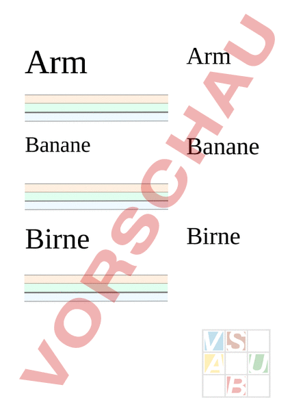 Arm Arm Banane Banane Birne Birne Dose Dose Krone Krone Nase Nase Palme Palme Salat Salat Turm Turm Tomate Tomate Wolke Wolke Zitrone Zitrone Ameise Ameise Ampel Ampel Pinsel Pinsel Pilz Pilz Blume Blume Zebra Zebra