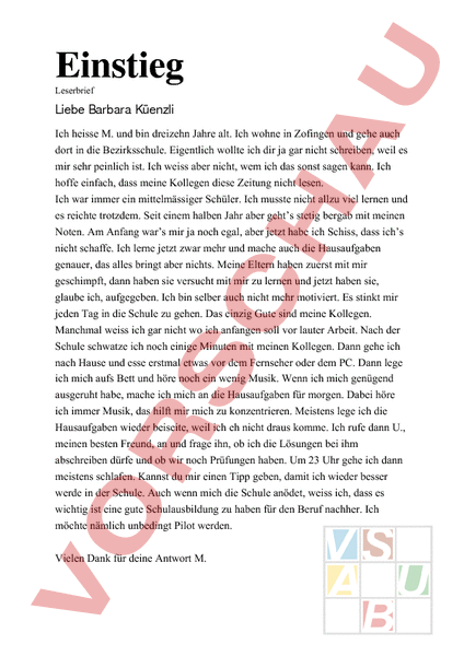 Einstieg Leserbrief Liebe Barbara Küenzli Ich heisse M. und bin dreizehn Jahre alt. Ich wohne in Zofingen und gehe auch dort in die Bezirksschule. Eigentlich wollte ich dir ja gar nicht schreiben, weil es mir sehr peinlich ist. Ich weiss aber nicht, wem ich das sonst sagen kann. Ich hoffe einfach, dass meine Kollegen diese Zeitung nicht lesen. Ich war immer ein mittelmässiger Schüler. Ich musste nicht allzu viel lernen und es reichte trotzdem. Seit einem halben Jahr aber gehts stetig bergab mit meinen Noten. Am Anfang wars mir ja noch egal, aber jetzt habe ich Schiss, dass ichs nicht schaffe. Ich lerne jetzt zwar mehr und mache auch die Hausaufgaben genauer, das alles bringt aber nichts. Meine Eltern haben zuerst mit mir geschimpft, dann haben sie versucht mit mir zu lernen und jetzt haben sie, glaube ich, aufgegeben. Ich bin selber auch nicht mehr motiviert. Es stinkt mir jeden Tag in die Schule zu gehen. Das einzig Gute sind meine Kollegen. Manchmal weiss ich gar nicht wo ich anfangen soll vor lauter Arbeit. Nach der Schule schwatze ich noch einige Minuten mit meinen Kollegen. Dann gehe ich nach Hause und esse erstmal etwas vor dem Fernseher oder dem PC. Dann lege ich mich aufs Bett und höre noch ein wenig Musik. Wenn ich mich genügend ausgeruht habe, mache ich mich an die Hausaufgaben für morgen. Dabei höre ich immer Musik, das hilft mir mich zu konzentrieren. Meistens lege ich die Hausaufgaben wieder beiseite, weil ich eh nicht draus komme. Ich rufe dann U., meinen besten Freund, an und frage ihn, ob ich die Lösungen bei ihm abschreiben dürfe und ob wir noch Prüfungen haben. Um 23 Uhr gehe ich dann meistens schlafen. Kannst du mir einen Tipp geben, damit ich wieder besser werde in der Schule. Auch wenn mich die Schule anödet, weiss ich, dass es wichtig ist eine gute Schulausbildung zu haben für den Beruf nachher. Ich möchte nämlich unbedingt Pilot werden. Vielen Dank für deine Antwort M. Wie ich lerne Kaum jemand würde seinem Arzt sagen: „Herr Doktor, ich bin krank, verschreiben Sie mir bitte das richtige Medikament! Ohne genaue Untersuchung, ohne Diagnose kann nämlich der beste Arzt nicht weiterhelfen. Je genauer ich beschreibe, was wo wie wehtut, desto besser weiss der Arzt, woran es fehlt und was man dagegen tun kann. Du kennst das auch aus der Technik: Es soll Leute geben, die stundenlang Geräte auseinander bauen und dann feststellen, dass der Stecker gar nicht in der Steckdose war! Bei Lernschwierigkeiten nützt es gar nichts, sich einzureden: „Ich kann mich nicht konzentrieren! Ich bin total gestresst! Stattdessen sollte man sich die Art der Schwierigkeiten klar machen. Am besten anhand eines Fragebogens: Kreuze bei jeder Frage nur ein zutreffendes Feld an! Ich habe Schwierigkeiten, mit den Hausaufgaben überhaupt anzufangen Das zeigt sich in Ablenkungen wie Spielen, Lesen, Musikhören Ich erreiche bei den Hausaufgaben das, was ich mir vorgenommen habe Mündliche Aufgaben erledige ich am Schluss In welcher Reihenfolge ich die Hausaufgaben erledige, überlasse ich dem Zufall Der Zeitdruck bei Klassenarbeiten macht mir zu schaffen Am Tag vor der Klassenarbeit lerne ich Meine Schwächen in den einzelnen Fächern kenne ich Vor Klassenarbeiten habe ich Angst Bei Klassenarbeiten habe ich Dinge vergessen, die ich vorher genau gekonnt habe Einen festen Arbeitsplatz habe ich Ich werde am Arbeitsplatz gestört Meine Notizzettel sind Für bestimmte Aufgaben benutze ich eine Bibliothek, suche nach Texten oder Zeitungsartikeln zum verlangten Thema Beim Deutschaufsatz verfehle ich das Thema Die Gliederung für einen Aufsatz mache ich am liebsten hinterher Beim Lesen eines längeren Textes erkenne ich das Wesentliche auf Anhieb Ich versuche, mich beim Lesen neuer Stoffe an ähnliche, mir bekannte Gebiete zu erinnern Ich behalte Vokabeln für den nächsten Tag ganz gut, habe viele nach einigen Tagen aber schon vergessen immer meistens selten nie oft manchmal kaum fast nie nie selten häufig meistens immer meistens ab und zu selten immer meistens selten nie sehr gelegentlich kaum besonders viel etwas mehr als sonst gezielter nicht ungefähr ziemlich genau ganz genau immer meistens manchmal ganz selten fast regelmässig kommt oft vor gelegentlich nein nie regelmässig wertlos manchmal sehr oft kaum lesbar meistens häufig gut lesbar immer ganz selten brauchbar nie ganz selten manchmal häufig fast immer sehr oft manchmal nie ja sehr oft manchmal nie fast nie sehr selten manchmal häufig nie selten häufig fast immer ja oft kommt vor nein überhaupt nicht genau wie sonst Ich mache beim Lernen gezielte, vorher eingeplante Pausen Es fällt mir schwer, nach der Pause wieder anzufangen Ich lerne mit Musikuntermalung Ich werde bei den Hausaufgaben von den Eltern »überwacht« Ich bin (ich wäre) dankbar für die Hausaufgabenüberwachung durch die Eltern Ich arbeite für bestimmte Fächer mit Kameraden zusammen Wie viel Spass mir ein Unterrichtsfach macht, hängt vom jeweiligen Lehrer ab Es gibt Fächer, für die ich gern arbeite Ich bin faul und darüber ärgere ich mich selbst Wenn ich etwas genau verstanden habe, arbeite ich meistens ganz gern Wenn ich etwas nicht verstanden habe, frage ich den Lehrer Es gibt Lehrer, vor denen ich Angst habe Ich frage nicht, weil ich Angst habe, wegen »dummer« Fragen ausgelacht zu werden Eigentlich gehe ich ganz gern zur Schule Summe der angekreuzten Felder (Jede senkrechte Spalte für sich zählen!) nein gelegentlich oft fast immer ja meistens manchmal nein immer meistens manchmal nie ja meistens manchmal nie unbedingt auf keinen Fall ja gelegentlich nie selten häufig regelmässig nur sehr stark überhaupt nicht etwas kein einziges eins zwei mehrere nein ich bin nicht faul so ist es manchmal trotzdem nicht manchmal immer so ist es nie manchmal oft immer ja, einige ja, einen manchmal nein genau ja, meistens kommt vor nein nein manchmal meistens ja die obere Zahl mal 4 nehmen die obere Zahl mal 3 nehmen die obere Zahl mal 2 nehmen die obere 