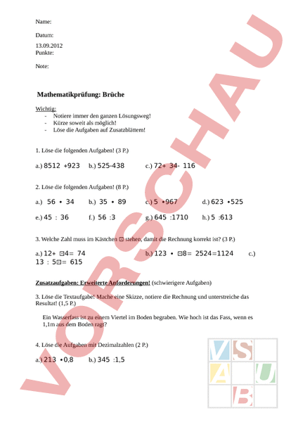 Name: Datum: 13.09.2012 Punkte: Note: Mathematikprüfung: Brüche Wichtig: Notiere immer den ganzen Lösungsweg! Kürze soweit als möglich! Löse die Aufgaben auf Zusatzblättern! 1. Löse die folgenden Aufgaben! (3 P.) a.) 8512 923 b.) 525-438 c.) 72 34- 116 2. Löse die folgenden Aufgaben! (8 P.) a.) 56 34 b.) 35 89 c.) 5 967 d.) 623 525 e.) 45 36 f.) 56 :3 g.) 645 :1710 h.) 5 :613 3. Welche Zahl muss im Kästchen stehen, damit die Rechnung korrekt ist? (3 P.) a.) 12 4 74 13 5 615 b.) 123 8 25241124 c.) Zusatzaufgaben: Erweiterte Anforderungen! (schwierigere Aufgaben) 3. Löse die Textaufgabe! Mache eine Skizze, notiere die Rechnung und unterstreiche das Resultat! (1,5 P.) Ein Wasserfass ist zu einem Viertel im Boden begraben. Wie hoch ist das Fass, wenn es 1,1m aus dem Boden ragt? 4. Löse die Aufgaben mit Dezimalzahlen (2 P.) a.) 213 0,8 b.) 345 :1,5