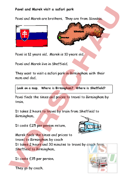 Pavel and Marek visit safari park Pavel and Marek are brothers. They are from Slovakia. Pavel is 12 years old. Marek is 10 years old. Pavel and Marek live in Sheffield. They want to visit safari park in Birmingham with their mum and dad. Look on map. Where is Birmingham? Where is Sheffield? Pavel finds the times and prices to travel to Birmingham by train. It takes 2 hours to travel by train from Sheffield to Birmingham. It costs £25 per person return. Marek finds the times and prices to travel to Birmingham by coach It takes 2 hours and 30 minutes to travel by coach from Sheffield to Birmingham. It costs £15 per person. They go by coach. The coach leaves Sheffield at 8.30 am. Then they catch bus to the safari park. It is 11.20 am when they get to the safari park. Look at the prices to go into the safari park. Adults £10.50 OAPs £8.00 Students £8.00 Children (age 5-16) £6.00 Children (under 5) Free Opening times 10 am to 7 pm. How much will it cost for Pavel, Marek and their mum and dad to get into the safari park? They go to see the animals first. Can you name the animals in the safari park? At 1.45 pm Marek, Pavel, mum and dad are hungry. They go for lunch. Look at the menu. Menu Beefburger Hamburger Cheeseburger Spaghetti Jacket Potato Fillings Chips Fish Pizza slice £3.50 £3.30 £3.80 £4.95 £2.80 £0.60 £1.00 £3.45 £2.20 Coffee Tea Fruit Juices Soft Drinks (cans) £1.20 £0.80 £1.05 £1.15 Crisps £0.50 Chocolate bars £0.55 Sandwiches £2.25 (ham, cheese, tuna) Salad 50p extra Marek has chips, fish and orange juice. Pavel has cheeseburger and coffee. Mum has spaghetti and tea. Dad has tuna salad sandwich with packet of crisps and can of cola. They buy 4 bars of chocolate. Find these on the menu. What is the total? After lunch Dad wants to find the cash machine. Marek wants to go shopping. Pavel wants the toilet. Mum wants information about the safari park. Write the name (Pavel, Marek, Mum, Dad) underneath the sign they need to look for. At 3.10 pm they visit the fun fair. They ride on the roller coaster. They ride on the carousel. They play on the bumper cars. At 5.30 pm they go back to the café. This time they all have jacket potato with cheese. They have cup of tea each. Look at the café menu. How much does it cost? At 7.15 pm they leave the safari park and go on the coach back to Sheffield. They are home at 10.00 pm. They are very tired. Draw the hands on the clocks to match the sentence: The coach leaves Sheffield. The coach gets to Birmingham. Marek and Pavel get to the safari park. Marek and Pavel have lunch. They catch the coach back to Sheffield. They arrive back at home.