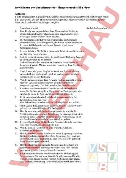 AnwältInnen der Menschenrechte Menschenrechtsfälle lösen Aufgabe: Finde bei folgenden Fällen heraus, welches Menschenrecht verletzt wird. Notiere zum jeden Fall den Artikel und ein Stichwort des betroffenen Menschenrechts in der rechten Spalte. Manchmal sind mehrere Lösungen möglich. 1. 2. 3. 4. 5. 6. 7. 8. 9. 10. 11. 12. 13. 14. 15. Menschenrechtsfall Frau K., die vor einigen Jahren ihren Mann und die Tochter in einem Autounfall verloren hat, kann ohne Einverständnis ihres Schwagers keinen anderen Mann heiraten. Die Gefängniswärter haben Hunde eingesetzt, um Gefangene einzuschüchtern. Sie haben gedroht, die Hunde auf sie loszulassen. In einem Fall haben sie zugelassen, dass der Hund einen Gefangenen beisst. In einer Fabrik in Nord-China müssen die Arbeiterinnen 10 Stunden am Tag ohne Pause arbeiten. Seit sie verhaftet wurden, haben die drei Männer Probleme Zugang zu ihren Anwälten zu bekommen. Mehrmals wurde den Anwälten nicht erlaubt, ihre Klienten zu besuchen. Zwei der Männer wurde der Kontakt zu ihren Anwälten ganz verwehrt. Zwei Frauen, die genau die gleiche Arbeit wie ihre männlichen Arbeitskollegen machen und gleich alt sind wie diese, erhalten weniger Lohn als ihre Kollegen. Von der drogensüchtigen Frau S. wurde ein Foto gemacht, welches sie beim Verlassen einer anonymen Selbsthilfegruppe für drogensüchtige zeigt. Das Foto wurde später veröffentlicht. Eine Frau wurde von ihrem Mann misshandelt und verlangte daraufhin die Scheidung. Er willigte unter der Bedingung ein, das sie ihm ihr Haus, ihr Auto und all ihren Besitz überlässt. E. litt unter einer lebensbedrohlichen Lungenentzündung. Im Krankenhaus wird der Frau eine Behandlung verwehrt, weil sie sich illegal im Land aufhält. 1812 wurden Schwarzafrikaner in Afrika für eine Flasche Whisky gekauft und in den USA für 1500 Dollar verkauft. Herr W. wird zum Militärdienst aufgefordert. Er schreibt der Militärbehörde, dass er diese Aufgabe aus Gewissensgründen nicht ausführen kann. Daraufhin bekommt er eine Aufforderung, sofort das Land zu verlassen und nie mehr zurück zu kehren. In einen Dorf können die Kinder die Primarschule nicht besuchen, weil es in erreichbarer Distanz keine gibt. Weil K. dunkler Hautfarbe ist, wird er nicht als Arzt im Krankenhaus eingestellt. Herr G. wurde in seinem Land wegen seiner Regierungskritischen Gedichte verhaftet und gefoltert. Sein Gesuch auf Asyl in einem anderen Land wurde abgelehnt. Er sagt, er wird wieder gefoltert, wenn er zurück geschickt wird. Herr P. schreibt an die regionale Zeitung einen Leserbrief. Die Redaktion fordert ihn auf einige Zeilen mit kritischen Inhalten gegen eine grossen Firma anders zu formulieren. Ein Elternverein lanciert eine Initiative für die Einführung des Schuluniforms. Sie möchten, dass alle Schülerinnen und Schüler von der ersten bis zur neunten Klassen ein Schuluniform tragen, weil es den Konsumzwang für Markenkleider entschärfen würde. Artikel des Menschenrechts AnwältInnen der Menschenrechte Menschenrechtsfälle lösen Lösungen Menschenrechtsfall Artikel und Stichwort des Menschenrechts 1. Art. 16 Eheschliessung 2. Art. 5 Folterverbot Art. 3 Sicherheit 3. Art. 24 Erholung und Freizeit 4. Art. 8 Rechtsschutz Art. 7 Gleichheit vor den Gesetz 5. Art. 2 Diskriminierung 6. Art. 12 Privatsphäre 7. Art. 17 Eigentum Art. 5 Folterverbot 8. Art. 3 Leben Art. 22 Soziale Sicherheit 9. Art. 4 Sklaverei 10 Art. 18 Gewissensfreiheit Art. 15 Staatszugehörigkeit 11. Art. 26 Bildung 12. Art. 2 Diskriminierung 13. Art. 14 Asyl Art. 18 Gewissenfreiheit 14. Art. 19 Meinungsfreiheit 15. Art. 3 Freiheit Art. 27 Teilnahme am kulturellen Leben