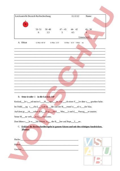 Lernkontrolle Deutsch Rechtschreibung 53- 51 6 50 -48 5.5 11.12.12 47 – 45 5 Name: 44- 42 4.5 41- 38 4 Unterschrift: A. Diktat 12 Pkte 0F/1F 11 Pkte 2/3 10 Pkte 4/5 9 Pkte etc B. Setze ie oder in die Lücken 16P Krokod_le s_nd meine L_bl_ngst_re, seitch einen F_lm über s_ gesehen habe. Im Frühl_ng r_cht d_ Luft m_lde und der H_mmel w_rd w_der blau. Auf dem gr_ch_schen Sch_ff sp_lte d_ Mus_k und d_ Passag_re tanzten. Seine M_ne verh_ss n_chts Gutes. Dort leben v_le w_lde Wesen, w_ der B_ber und Rept_l_en C. Erkläre die Rechtschreiberegeln in ganzen Sätzen und mit den richtigen Ausdrücken. 3Punkte Hacke: Haken: Greifen:_ D. Setze oder ä in die einfach unterstrichene Lücke und eu oder äu in die fett unterstrichene Lücke. 16Pkt E. Wiederholung Zeiten Setze die Sätze ins Plusquamperfekt 6 Punkte Ich werde ihr verzeihen. Er misst den Vorhang. Bist du wieder gesund? Diktat A. 1. Ratten und Katzen schliefen in jener Nacht oft auf den Holzlatten. 2. Der Drucker meiner Mutter gehört dem Bäcker vom selben Flur. 3. Welcher Trottel hat das holprige Karren gewonnen? 4. Die Reifen sind beim Wettrennen kaputt gegangen. 5. Der Geizkragen fliegt wahrhaftig. 6. Das Gebrüll des Säuglings geht mir auf die Nerven.