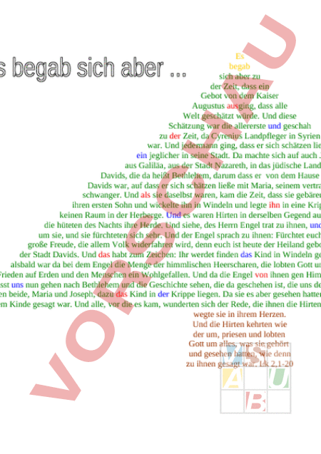 Es begab sich aber zu der Zeit, dass ein Gebot von dem Kaiser Augustus ausging, dass alle Welt geschätzt würde. Und diese Schätzung war die allererste und geschah zu der Zeit, da Cyrenius Landpfleger in Syrien war. Und jedermann ging, dass er sich schätzen ließe, ein jeglicher in seine Stadt. Da machte sich auf auch Joseph aus Galiläa, aus der Stadt Nazareth, in das jüdische Land zur Stadt Davids, die da heißt Bethlehem, darum dass er von dem Hause und Geschlechte Davids war, auf dass er sich schätzen ließe mit Maria, seinem vertrauten Weibe, die war schwanger. Und als sie daselbst waren, kam die Zeit, dass sie gebären sollte. Und sie gebar ihren ersten Sohn und wickelte ihn in Windeln und legte ihn in eine Krippe, denn sie hatten sonst keinen Raum in der Herberge. Und es waren Hirten in derselben Gegend auf dem Felde bei den Hürden, die hüteten des Nachts ihre Herde. Und siehe, des Herrn Engel trat zu ihnen, und die Klarheit des Herrn leuchtete um sie, und sie fürchteten sich sehr. Und der Engel sprach zu ihnen: Fürchtet euch nicht! Siehe, ich verkündige euch große Freude, die allem Volk widerfahren wird, denn euch ist heute der Heiland geboren, welcher ist Christus, der Herr, in der Stadt Davids. Und das habt zum Zeichen: Ihr werdet finden das Kind in Windeln gewickelt und in einer Krippe liegen. Und alsbald war da bei dem Engel die Menge der himmlischen Heerscharen, die lobten Gott und sprachen: Ehre sei Gott in der Höhe und Frieden auf Erden und den Menschen ein Wohlgefallen. Und da die Engel von ihnen gen Himmel fuhren, sprachen die Hirten untereinander: Lasst uns nun gehen nach Bethlehem und die Geschichte sehen, die da geschehen ist, die uns der Herr kundgetan hat. Und sie kamen eilend und fanden beide, Maria und Joseph, dazu das Kind in der Krippe liegen. Da sie es aber gesehen hatten, breiteten sie das Wort aus, welches zu ihnen von diesem Kinde gesagt war. Und alle, vor die es kam, wunderten sich der Rede, die ihnen die Hirten gesagt hatten. Maria aber behielt alle diese und be wegte sie in ihrem Herzen. Und die Hirten kehrten wie der um, priesen und lobten Gott um alles, was sie gehört und gesehen hatten, wie denn zu ihnen gesagt war. Lk 2,1-20