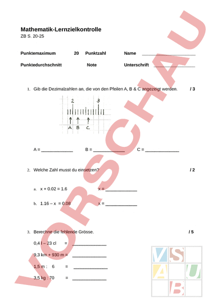 Mathematik-Lernzielkontrolle ZB S. 20-25 Punktemaximum 20 Punktedurchschnitt Punktzahl Note Name Unterschrift 1. Gib die Dezimalzahlen an, die von den Pfeilen A, & angezeigt werden. 2. Welche Zahl musst du einsetzen? a. 0.02 1.6 b. 1.16 – 0.08 3. Berechne die fehlende Grösse. 0,4 – 23 cl 9,3 km 930 1,5 : 6 3,5 kg 70 /3 /2 /5 4 0,6 dl 4. 10