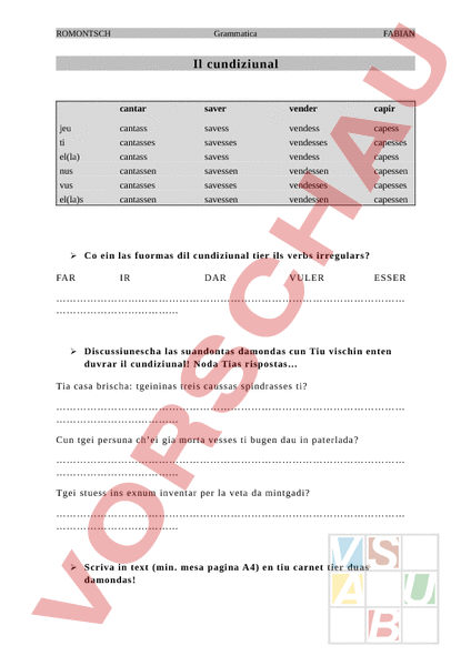 ROMONTSCH Grammatica FABIAN Il cundiziunal jeu ti el(la) nus vus el(la)s cantar saver vender capir cantass cantasses cantass cantassen cantasses cantassen savess savesses savess savessen savesses savessen vendess vendesses vendess vendessen vendesses vendessen capess capesses capess capessen capesses capessen Co ein las fuormas dil cundiziunal tier ils verbs irregulars? FAR IR DAR VULER ESSER . Discussiunescha las suandontas damondas cun Tiu vischin enten duvrar il cundiziunal! Noda Tias rispostas Tia casa brischa: tgeininas treis caussas spindrasses ti? . Cun tgei persuna chei gia morta vesses ti bugen dau in paterlada? . Tgei stuess ins exnum inventar per la veta da mintgadi? . Scriva in text (min. mesa pagina A4) en tiu carnet tier duas damondas!