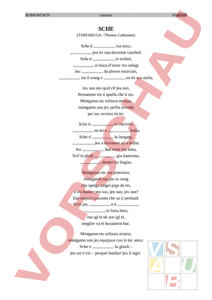 ROMONTSCH canzuns SCHE (TARTARUGA Thomas Cathomen) Sche ti .,.,.,.,.,.,.,.,.,., ina miur, .,.,.,.,.,.,.,.,.,., jeu tei cun daventar caschiel. Sche ti .,.,.,.,.,.,.,.,.,., in tschiel, .,.,.,.,.,.,.,.,.,., ei buca desser mo sulegl. Jeu .,.,.,.,.,.,.,.,.,., da plover ensiviars, .,.,.,.,.,.,.,.,.,., tut il smog .,.,.,.,.,.,.,.,.,., en tei sco steila. Jeu sun mo quel chjeu sun, Persuenter eis ti quella che ti eis. Mintgaton eis schizun tetezza, mintgaton sun jeu perfin avunda per ina versiun da tei. Sche ti .,.,.,.,.,.,.,.,.,., in caschiel, .,.,.,.,.,.,.,.,.,., en tei .,.,.,.,.,.,.,.,.,., buliu. Sche ti .,.,.,.,.,.,.,.,.,., in lungatg, .,.,.,.,.,.,.,.,.,., jeu discuorer ed tedlar. Jeu .,.,.,.,.,.,.,.,.,., dad esser ina letra, Schin plaid .,.,.,.,.,.,.,.,.,., gia damemia, .,.,.,.,.,.,.,.,.,., denter las lingias. Mintgaton eis ina princessa, mintgaton sun jeu in rustg che spetga zatgei pign da tei, ti eis buna jeu sun, jeu sun, jeu sun? Dat enqual caussetta che sa ir profund. Sche jeu .,.,.,.,.,.,.,.,.,., ti .,.,.,.,.,.,.,.,.,., .,.,.,.,.,.,.,.,.,., ei forsa bien, mo igl ei ok sco igl ei, meglier va ei bunamein buc. Mintgaton eis schizun aviarta, mintgaton sun jeu equipaus cun in tec amur. Sche ti .,.,.,.,.,.,.,.,.,., la glisch – jeu sai ti eis – perquei bandunjeu il stgir. FABIAN