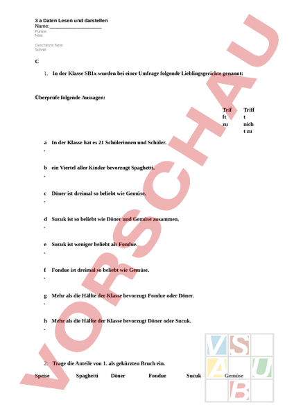 3 Daten Lesen und darstellen Name:_ Punkte Note Geschätzte Note: Schnitt 1. In der Klasse SB1x wurden bei einer Umfrage folgende Lieblingsgerichte genannt: Überprüfe folgende Aussagen: Trif ft zu In der Klasse hat es 21 Schülerinnen und Schüler. b ein Viertel aller Kinder bevorzugt Spaghetti. c Döner ist dreimal so beliebt wie Gemüse. d Sucuk ist so beliebt wie Döner und Gemüse zusammen. e Sucuk ist weniger beliebt als Fondue. f Fondue ist dreimal so beliebt wie Gemüse. Mehr als die Hälfte der Klasse bevorzugt Fondue oder Döner. h Mehr als die Hälfte der Klasse bevorzugt Döner oder Sucuk. 2. Trage die Anteile von 1. als gekürzten Bruch ein. Speise Spaghetti Döner Fondue Sucuk Gemüse Triff nich zu Anteil als Bruch 3. Die SB1y wurde nach Ihrem Alter befragt. Vervollständige folgende Aussagen: a. Die meisten Schülerinnen und Schüler sind Jahre alt. b. Eine Schülerin ist Jahre alt. c. Es hat gleich viele wie . d. Es hat gleich viele wie und zusammen. 4. Gib als gekürzten Bruch an (Aufgabe 3.): a. b. c. d. der Klasse sind Jungs. der Klasse sind 14 Jahre alt. der Jungs sind 12. der Mädchen sind nicht 14 Jahre alt. 5. In dieser Grafik wird dargestellt, wie oft Kinder Namens Peter auf die Welt kamen. 5.1 Vervollständige: a. Im Jahr 1990 wurden Peter geboren. . Im Jahr wurden 15 Peter geboren. c. In den Jahren und wurden je Peter geboren. . Vom Jahr 2009 zum Jahr 2010 ist die Zahl um . 5.2 Trage die Line für den Namen Petra in der Tabelle nach: Jahr Name Peter Name Petra 1 9 8 7 2 2 8 1988 21 14 1 9 8 9 1 5 1 2 1990 1991 1992 1993 1994 1995 1996 1997 1998 1999 2000 2001 2002 2003 200 4 2005 200 6 2007 2008 2009 2010 2011 14 12 8 9 5 8 3 4 3 4 4 4 2 2 4 5 3 5 3 3 4 4 9 9 9 10 6 6 5 3 2 1 2 4 4 2 6 2 2 1 1 1 5.3 Setze für den Namen Peter ein: a. Zwischen diesen Jahren nahm der Namen am meisten zu: b. Zwischen diesen Jahren nahm der Namen am meisten ab: 6. Trage in die Tabelle ein: Von den 24 Schülerinnen und Schülern bevorzugen 16 Mathematik, 14 M&U, 112 Musik und 12 Zeichnen. 7. Luc und Erik haben je ein Diagramm zu der Länge der Schulwege ihrer Klasse gemacht. a. Welches ist der Vorteil von Eriks Diagramm? b. Welches ist der Vorteil von Lucs Diagramm? c. Wie viele SuS haben einen Schulweg zwischen 20 und 30 min? d. Wie viele SuS haben einen Schulweg zwischen 30 und 40 min?