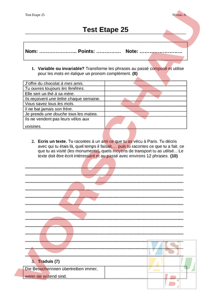 Test Etape 25 Niveau Test Etape 25 Nom: Points: Note: 1. Variable ou invariable? Transforme les phrases au passé composé et utilise pour les mots en italique un pronom complément. (8) Joffre du chocolat à mes amis. Tu ouvres toujours les fenêtres. Elle sert un thé à sa mère. Ils reçoivent une lettre chaque semaine. Vous savez tous les mots. Il ne bat jamais son frère. Je prends une douche tous les matins. Ils ne vendent pas leurs vélos aux voisines. 2. Ecris un texte. Tu racontes à un ami ce que tu as vécu à Paris. Tu décris avec qui tu étais là, quel temps il faisait, puis tu racontes ce que tu fait, ce que tu as visité (les monuments), quels moyens de transport tu as utilisé. Le texte doit être écrit intéressant et au passé avec environs 12 phrases. (10) 3. Traduis (7) Die Besucherinnen übertreiben immer, wenn sie wütend sind. Test Etape 25 Niveau Wir haben im Vorort parkiert und sind zu Fuss ins Zentrum gegangen. Der Führer hat uns die ganze Stadt gezeigt und wir haben uns nie gelangweilt. Sie fällt fast vor Müdigkeit um, das beunruhigt mich sehr. Die Mädchen sind aufgeregt, weil sie das Flugzeug vielleicht nicht erwischen. Man darf hier nicht parkieren, die freien Plätze sind für ein Hotel reserviert. Pierre beginnt den Führer von Paris zu lesen. Er möchte ein lebendiges Schauspiel sehen. 4. Conjugue les verbes et donne le passé composé 1ère pers. sg. (3) reagieren drücken reichen/hinstrecken 5. Lis larticle (prochaine page) et réponds aux questions (en français et avec tes mots). 1 Cherche la ligne quatorze sur le plan et marque la avec une couleur. (1) 2 La nouvelle ligne sappelle Météor. Explique ce nom (1) Test Etape 25 Niveau 3 Que veut dire RER Cest quoi, le RER (2) 4 Donne trois bonnes raisons pour lesquelles il faut prendre le métro. (Ecris en phrases entières) (3) Bonne Chance