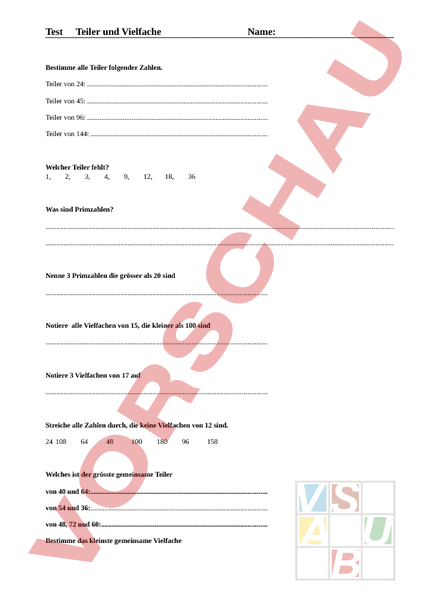 Test Teiler und Vielfache Name: Bestimme alle Teiler folgender Zahlen. Teiler von 24: . Teiler von 45: . Teiler von 96: . Teiler von 144: . Welcher Teiler fehlt? 1, 2, 3, 4, 9, 12, 18, 36 Was sind Primzahlen? . . Nenne 3 Primzahlen die grösser als 20 sind Notiere alle Vielfachen von 15, die kleiner als 100 sind Notiere 3 Vielfachen von 17 auf Streiche alle Zahlen durch, die keine Vielfachen von 12 sind. 24 108 64 48 100 180 96 158 Welches ist der grösste gemeinsame Teiler von 40 und 64:. von 54 und 36:. von 48, 72 und 60:. Bestimme das kleinste gemeinsame Vielfache von 8 und 12:. 27 und 36: von 4, 5, 8 und 15:. Trage in den drei leeren Feldern die kleinsten Vielfachen ein. In einem schmalen langen Gartenstück werden drei Reihen mit verschiedenen Blumen gepflanzt. An der Wand werden im Abstand von 30 cm Sonnenblumen gesteckt. Davor kommen Rosenstöcke im Abstand von einem Meter und zuvorderst eine Reihe mit Katzenminze, die in einem Pflanzabstand von 40 cm eingesetzt werden. Nach wie vielen Zentimetern stehen je eine Pflanze einer Reihe genau hintereinander? Auf einem Busbahnhof verkehren die Linien A, und C. Ab 5 Uhr am Morgen nehmen die Busse ihren Taktfahrplan auf, das heisst die Busse der Linien fahren in regelmässigen Abständen. Der erste Bus fährt alle 9 Minuten, der zweite Bus alle 6 Minuten und der dritte Bus alle 8 Minuten. Wann fahren das nächste Mal die Busse aller Linien gleichzeitig ab? Ein Bastler baut in einen Kasten Leisten für Tablare ein. Auf der rechten Seite setzt er die Leisten in einem Abstand von 15 cm. Auf der linken Seite macht er irrtümlicherweise einen Abstand von 25 cm. Wie viele Tablare kann er waagrecht anbringen, wenn der Kasten eine Höhe von 2m 45 cm hat? .