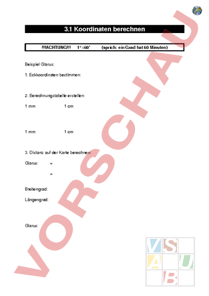 3.1 Koordinaten berechnen !!!ACHTUNG!!! 160 Beispiel Glarus: 1. Eckkoordinaten bestimmen: 2. Berechnungstabelle erstellen: 1 mm 1 cm 1 mm 1 cm 3. Distanz auf der Karte berechnen: Glarus: Breitengrad: Längengrad: Glarus: (sprich: ein Grad hat 60 Minuten)